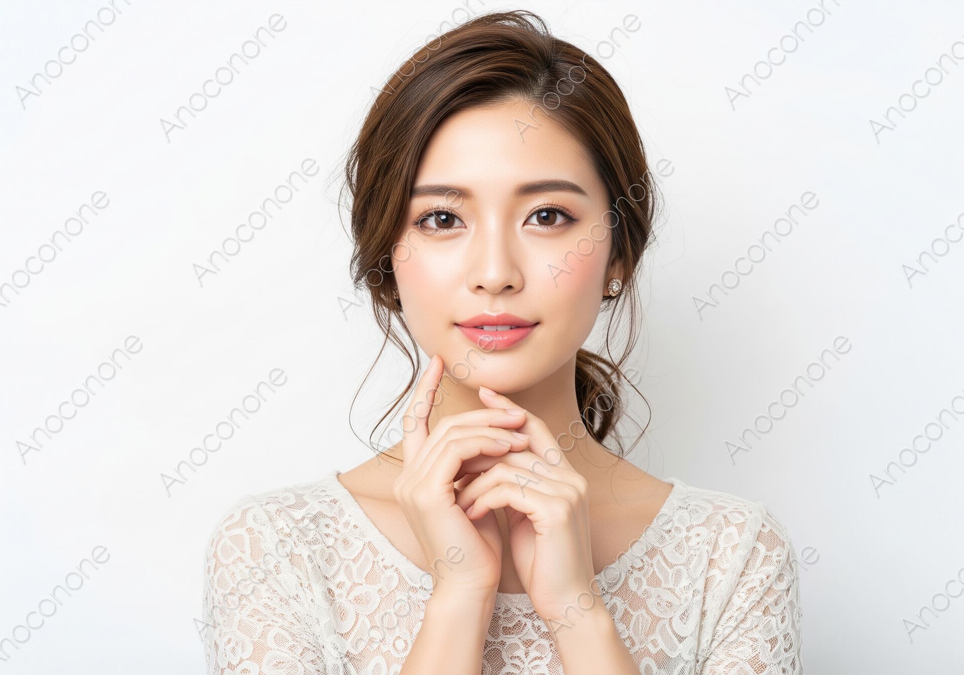 画像素材:レースのトップスを着用し、あごの下に手を添えるポーズでカメラを見つめている女性のポートレートです。髪は緩やかにまとめられ、顔周りの自然な後れ毛が優雅な印象を与えています。健康的で透明感のある肌と、上品な雰囲気は、高級な美容製品やブライダル、ファッション、エレガントさを訴求するコンテンツに最適な画像素材です。