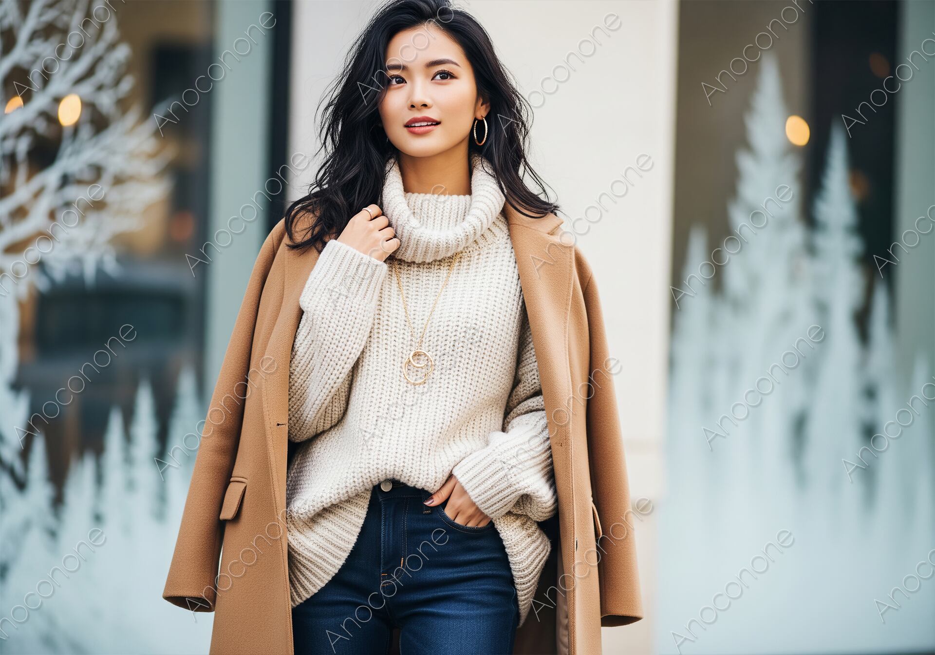 画像素材:都会の街中で、冬のファッションに身を包んだ女性が外を歩いている様子を捉えた画像です。女性は、白いタートルネックのニットセーターとダークブルーのジーンズを着用し、肩にキャメル色のコートを羽織っています。胸元のペンダントとイヤリングがエレガントな印象を添え、洗練された冬のコーディネートを表現しています。アパレルやライフスタイル関連のコンテンツに最適です。