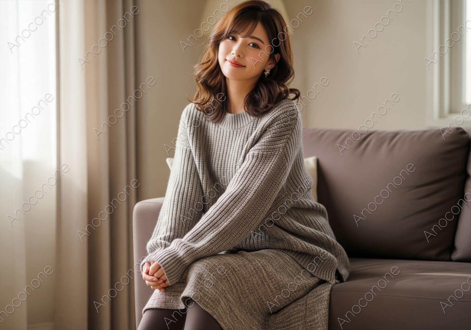 画像素材:温かい日差しが差し込む自宅のリビングで、ソファに座りくつろいでいる女性の画像です。女性は、グレーのニットのセットアップのような服装で、両手を膝の上で重ね、穏やかな笑顔でカメラを見つめています。落ち着いた色調の室内空間と、女性の柔らかな表情が、優雅で快適なプライベートな時間を表現しています。ライフスタイルやアパレル関連に最適です。