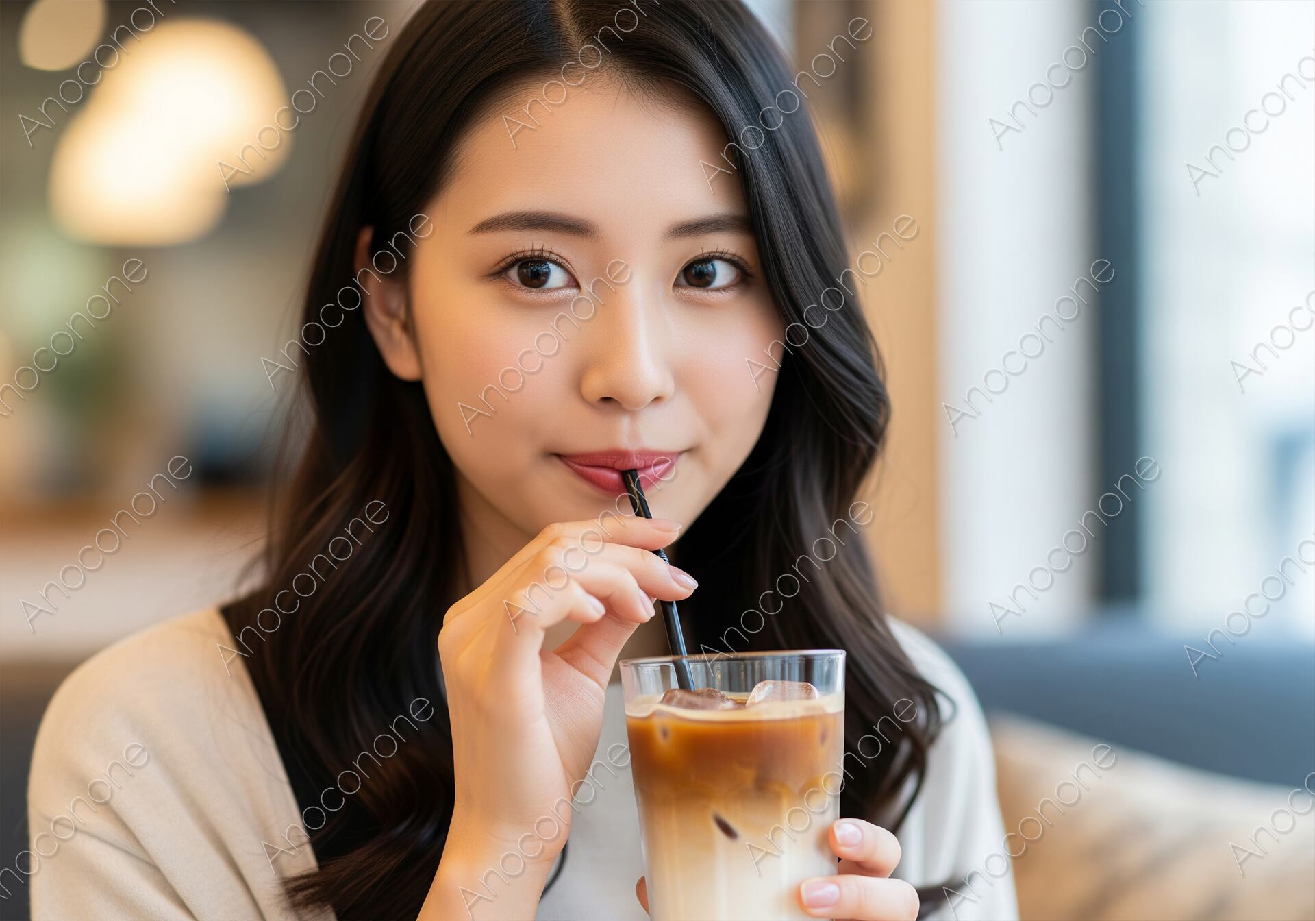 画像素材:明るい照明のカフェのソファ席で、アイスカフェラテを飲んでいる女性のクローズアップ画像です。女性は、白いトップスを着て、グラスを片手で持ちながら、ストローを口に添え、カメラに穏やかな視線を送っています。美しいレイヤーのカフェラテと、女性の優雅な表情が、リラックスした上質なカフェタイムのひとときを演出しています。