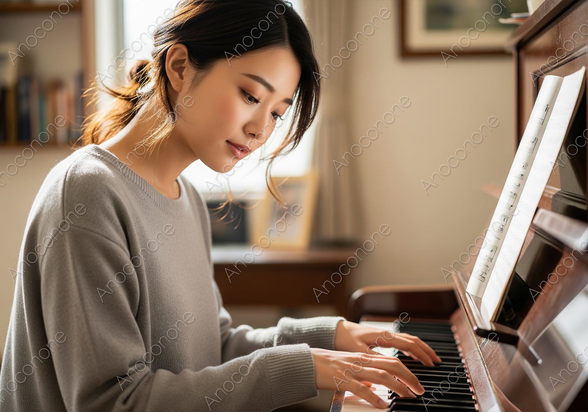 画像素材:温かい光が差し込む室内のアップライトピアノに向かい、真剣な表情で鍵盤を弾く女性の姿を捉えた一枚。穏やかな雰囲気の中で趣味のピアノに没頭し、優雅な時間を過ごしている様子が伝わってきます。集中して演奏する横顔は美しく、落ち着いた大人のライフスタイルを象徴する写真素材です。
