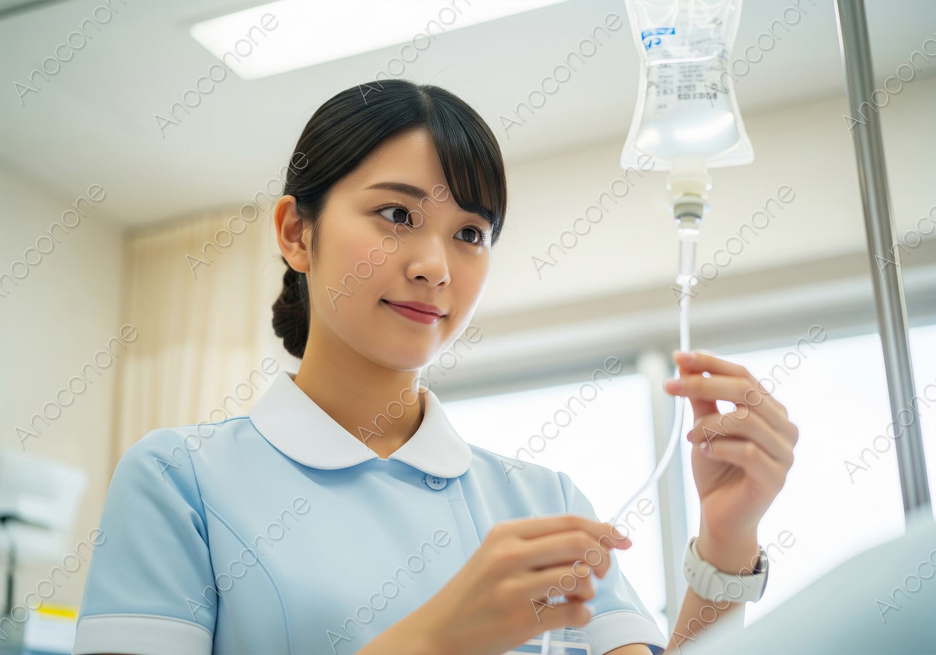 画像素材:病室で患者の点滴を確認している看護師の姿を、ローアングルで捉えたアップ。水色のナース服を着用し、真剣な表情の中にも優しさを含んだ眼差しで点滴の状態を確認しています。高い専門性と献身的なケアを提供する医療従事者のイメージに最適な、信頼感のある写真素材です。