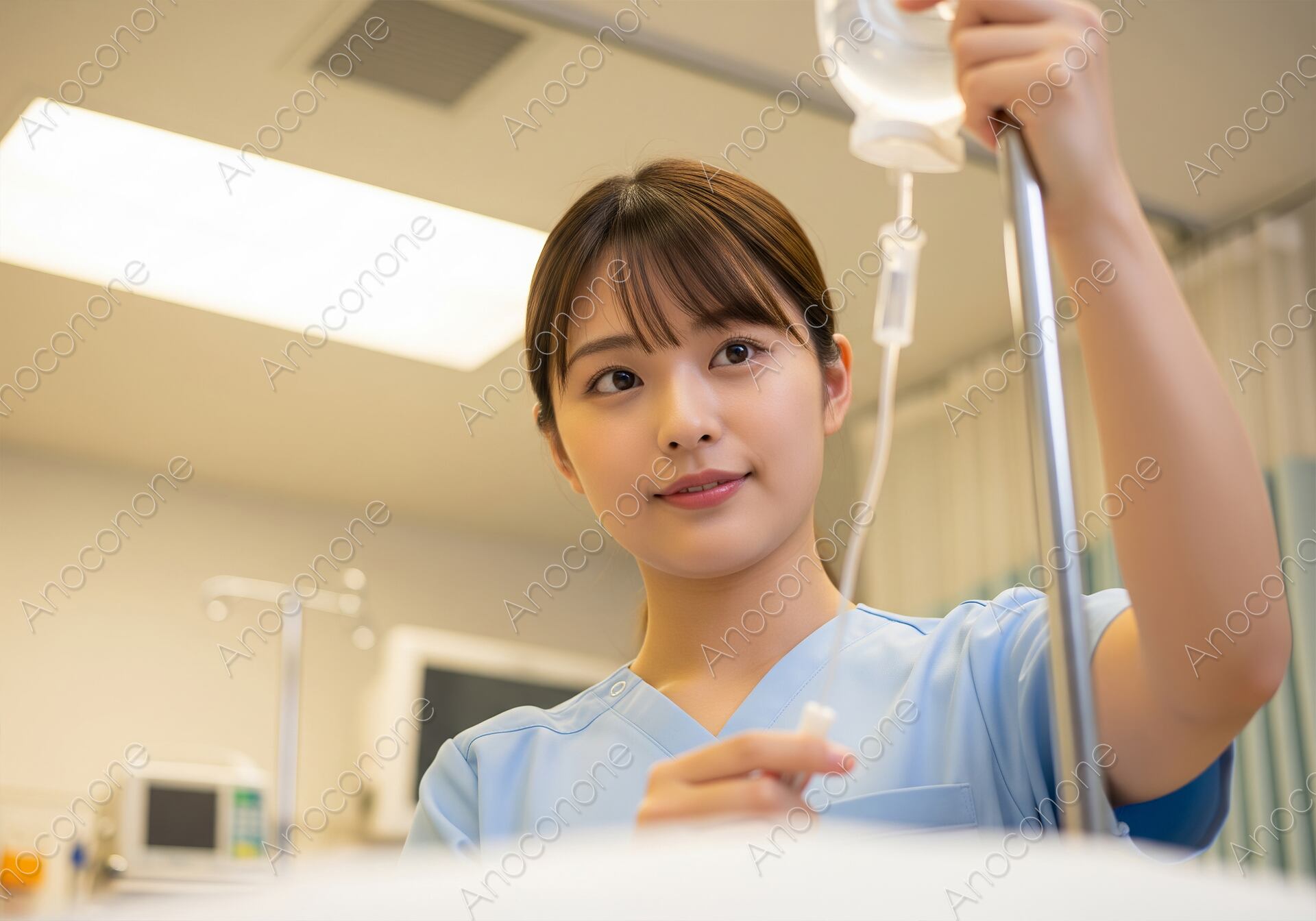 画像素材:病院の病室で、点滴の調整と確認を行う看護師の姿を、ローアングルで捉えたアップ。水色の制服を着用し、患者の状態を気にかけながら、責任感を持って業務にあたる真剣で献身的な表情が印象的です。高い専門性と温かいケアを象徴する、医療現場のイメージに最適な写真素材です。