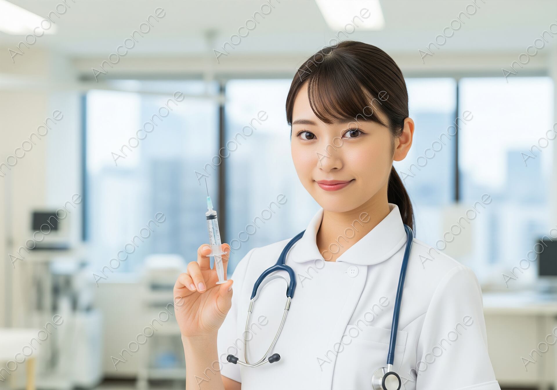画像素材:病院の診察室や処置室のような場所で、白衣に聴診器をかけ、注射器を持って正面に向かって微笑みかけている看護師のアップ。明るい室内と穏やかな笑顔が、医療に対する信頼感と安心感を高めます。ワクチン接種や医療、健康、美容クリニックのイメージに最適な写真素材です。