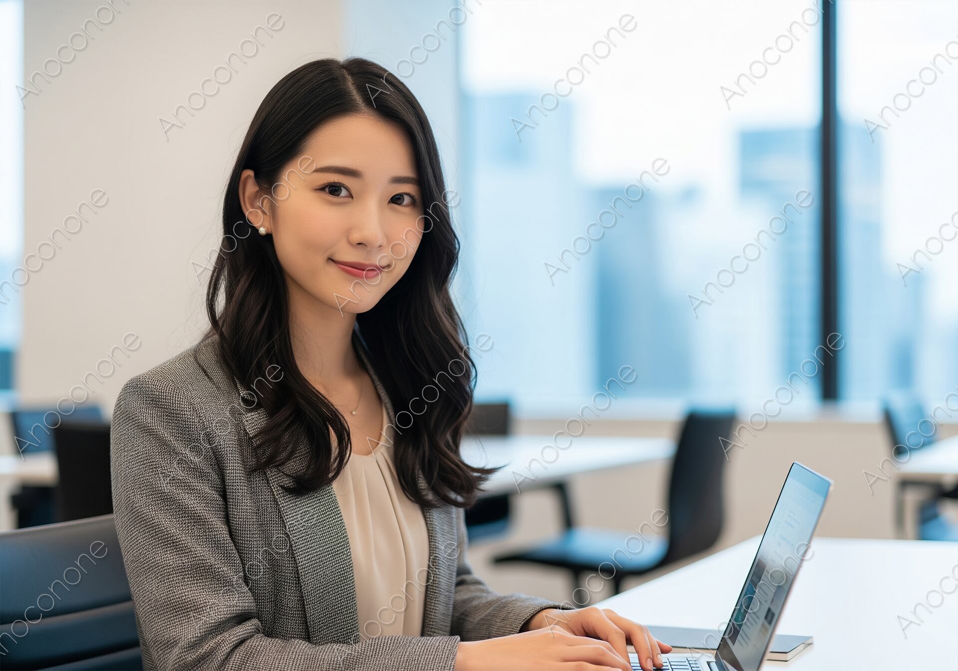 画像素材:都会の高層ビルが見える窓際のオフィスで、ノートパソコンに向かって仕事をする女性のアップ。グレーのジャケットを着用し、優しく自信に満ちた笑顔をこちらに向けています。現代の働く女性やキャリア、IT、ビジネスシーンを表現するのに最適な、清潔感とプロフェッショナルな雰囲気に満ちた写真素材です。
