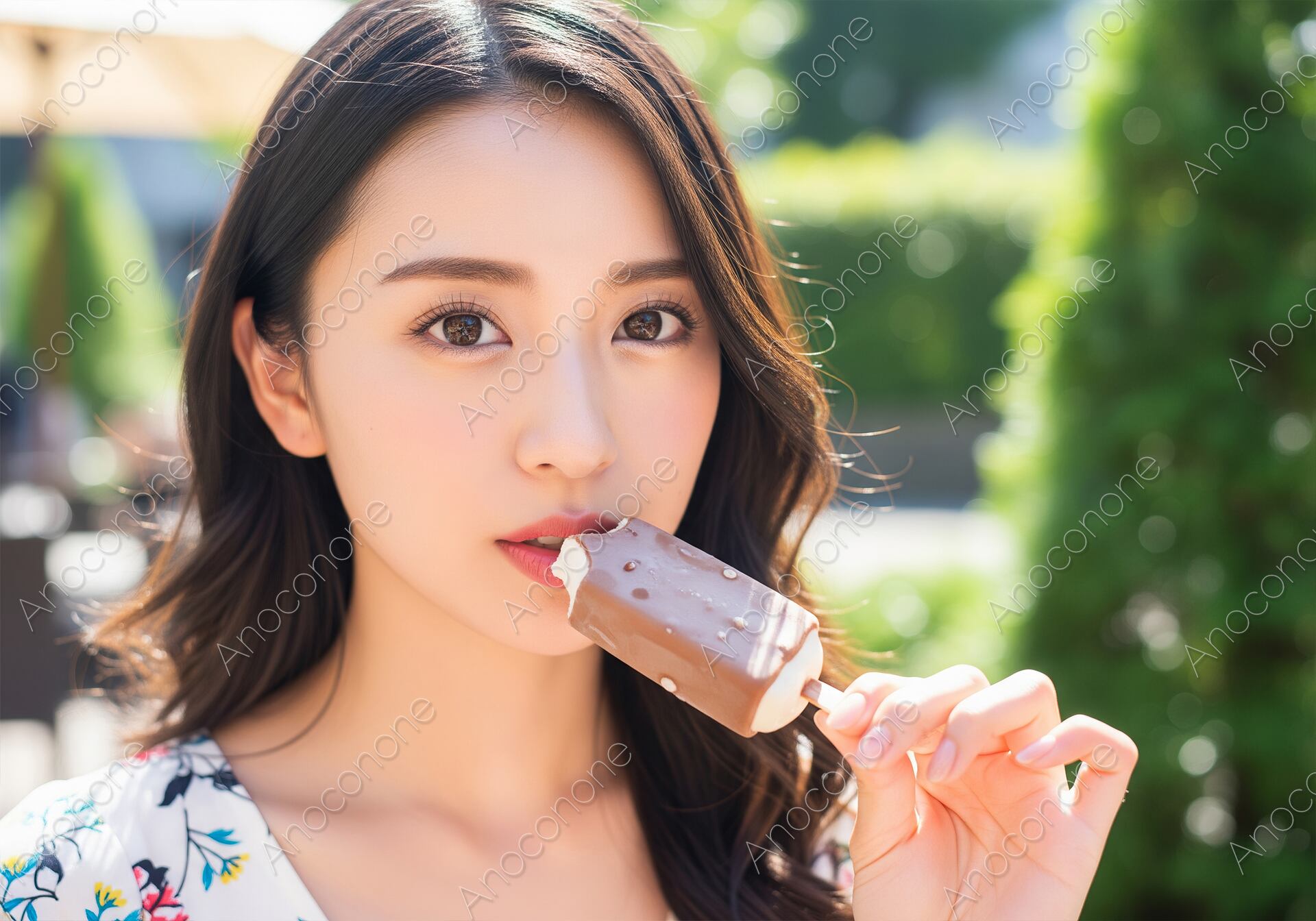 画像素材:晴れた屋外のテラスのような場所で、チョコレートコーティングされたバーアイスを口に運ぶ女性のアップ。潤んだ瞳とアイスを食べる姿が魅力的で、夏の暑い日に楽しむリラックスしたひとときが伝わってきます。アイスクリームやスイーツ、夏のライフスタイルを表現するのに最適な写真素材です。