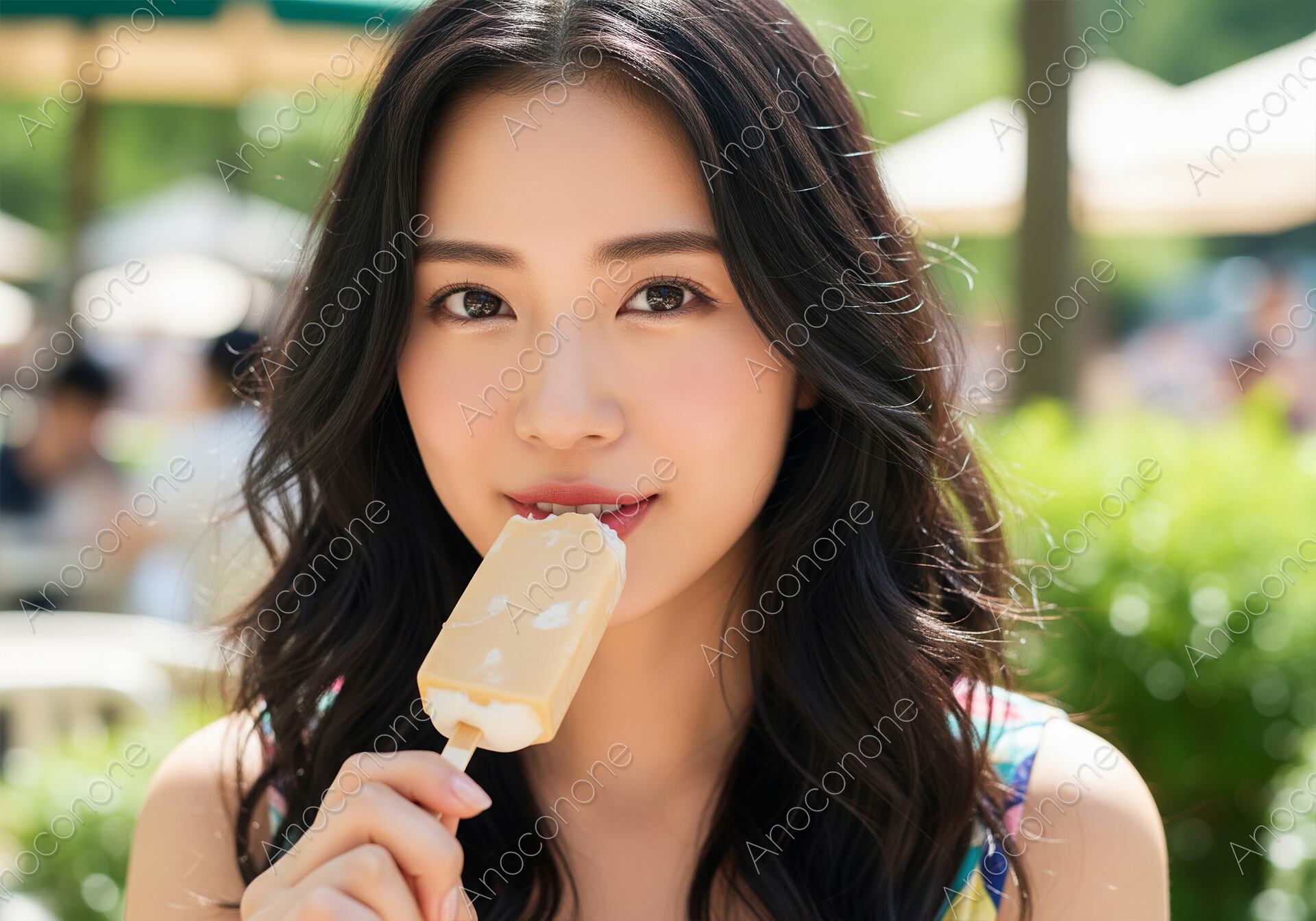 画像素材:日差しの明るい屋外のテラスのような場所で、キャラメル風味のアイスキャンディーを口に運ぶ女性のアップ。潤んだ瞳とアイスを食べる姿が魅力的で、夏の暑い日に楽しむリラックスしたひとときが伝わってきます。アイスクリームやスイーツ、夏のライフスタイルを表現するのに最適な、可愛らしい写真素材です。
