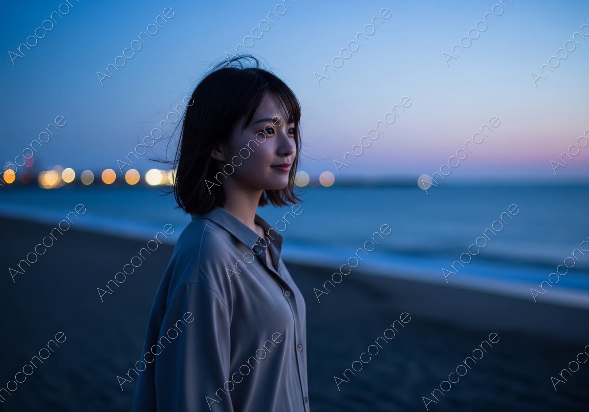画像素材:夕暮れから夜に移り変わるブルーモーメントの海辺で、穏やかな表情で遠くを見つめる女性の横顔を捉えたポートレートです。背景の海と空の深い青色が、女性の凛とした横顔と相まって、静かで幻想的な雰囲気を醸し出しています。人生の岐路、決意、静寂などのテーマを表現したい広告やエディトリアルコンテンツに、深い情感を与える高品位な素材です。
