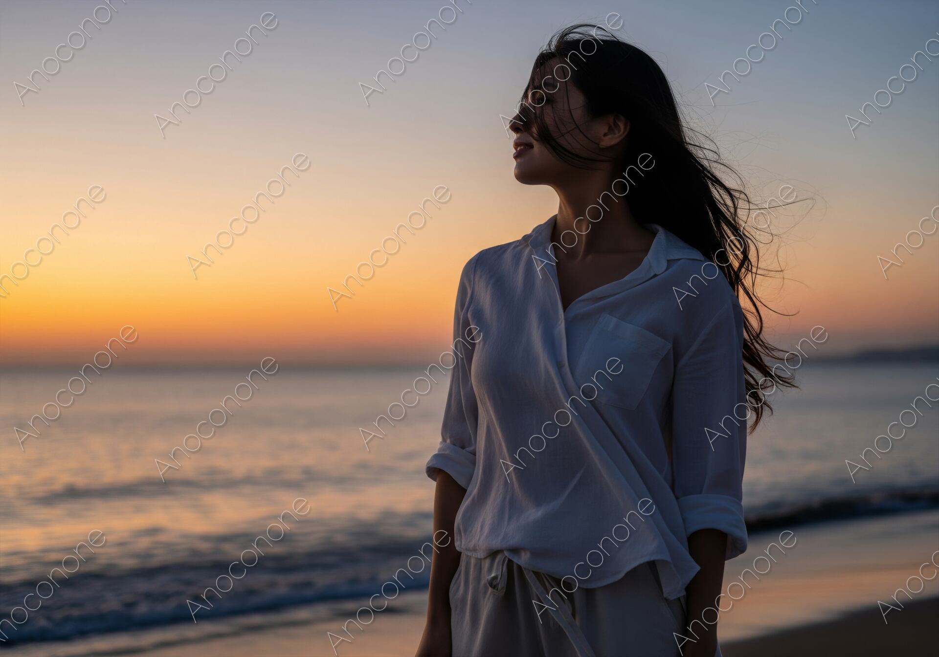 画像素材:夕暮れのビーチで、美しいグラデーションに染まる水平線を見つめる女性のポートレートです。潮風に長く黒い髪をなびかせ、白いシャツ姿で佇む姿は、情緒的でリラックスしたムードを醸し出しています。ロマンス、旅行、ライフスタイル、美容、広告、ウェブサイトの背景など、感動的で落ち着いた雰囲気を出したいクリエイティブに最適な一枚です。