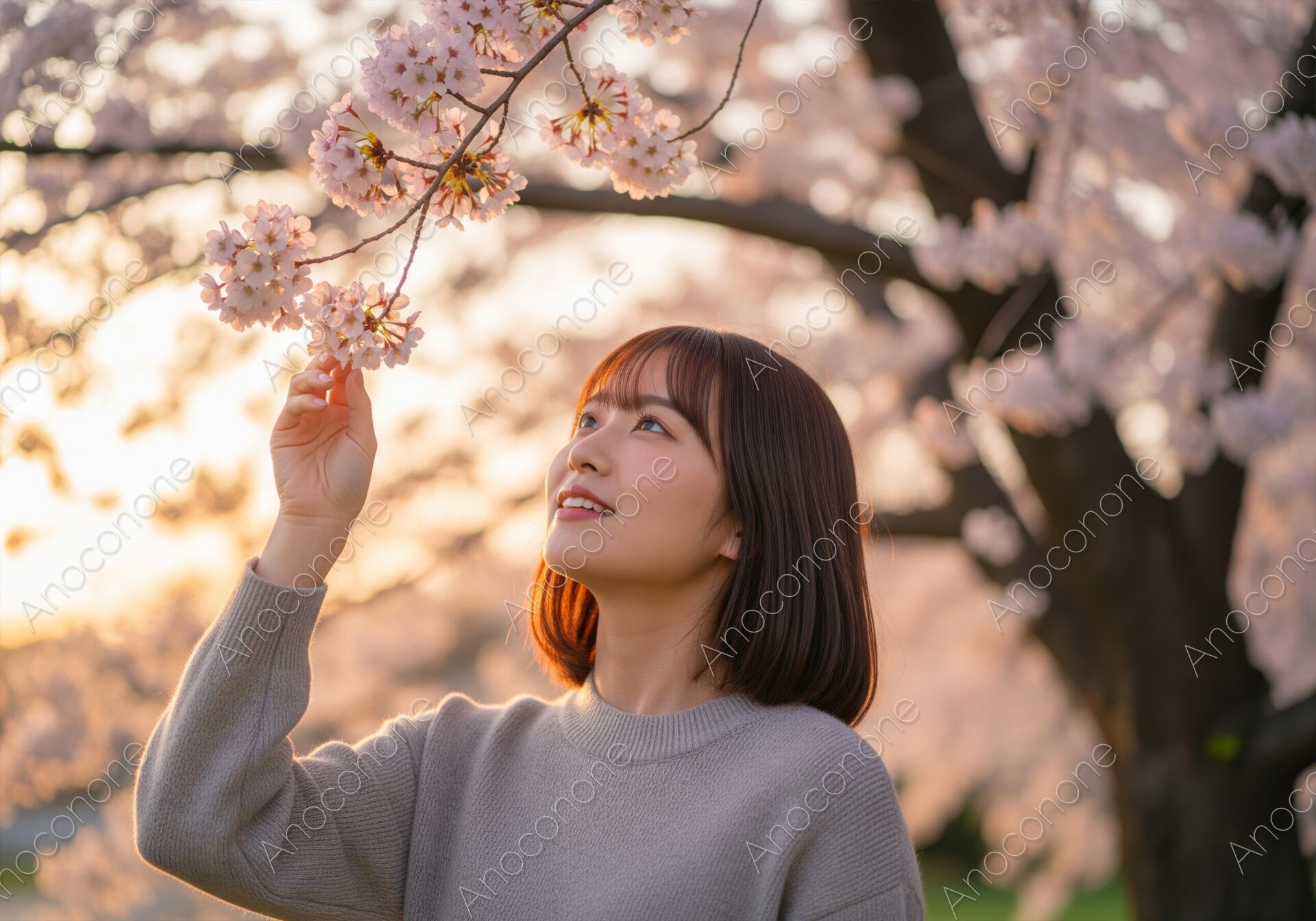 画像素材:夕日の柔らかな光を浴びながら、桜の枝にそっと手を伸ばし微笑む女性のポートレートです。暖色系の光に包まれ、女性の表情と桜の花びらが優しく輝き、希望に満ちた春の訪れを表現しています。ライフスタイル、美容、ファッション、旅行など、優しく感動的な雰囲気を伝えるためのクリエイティブに最適な一枚です。