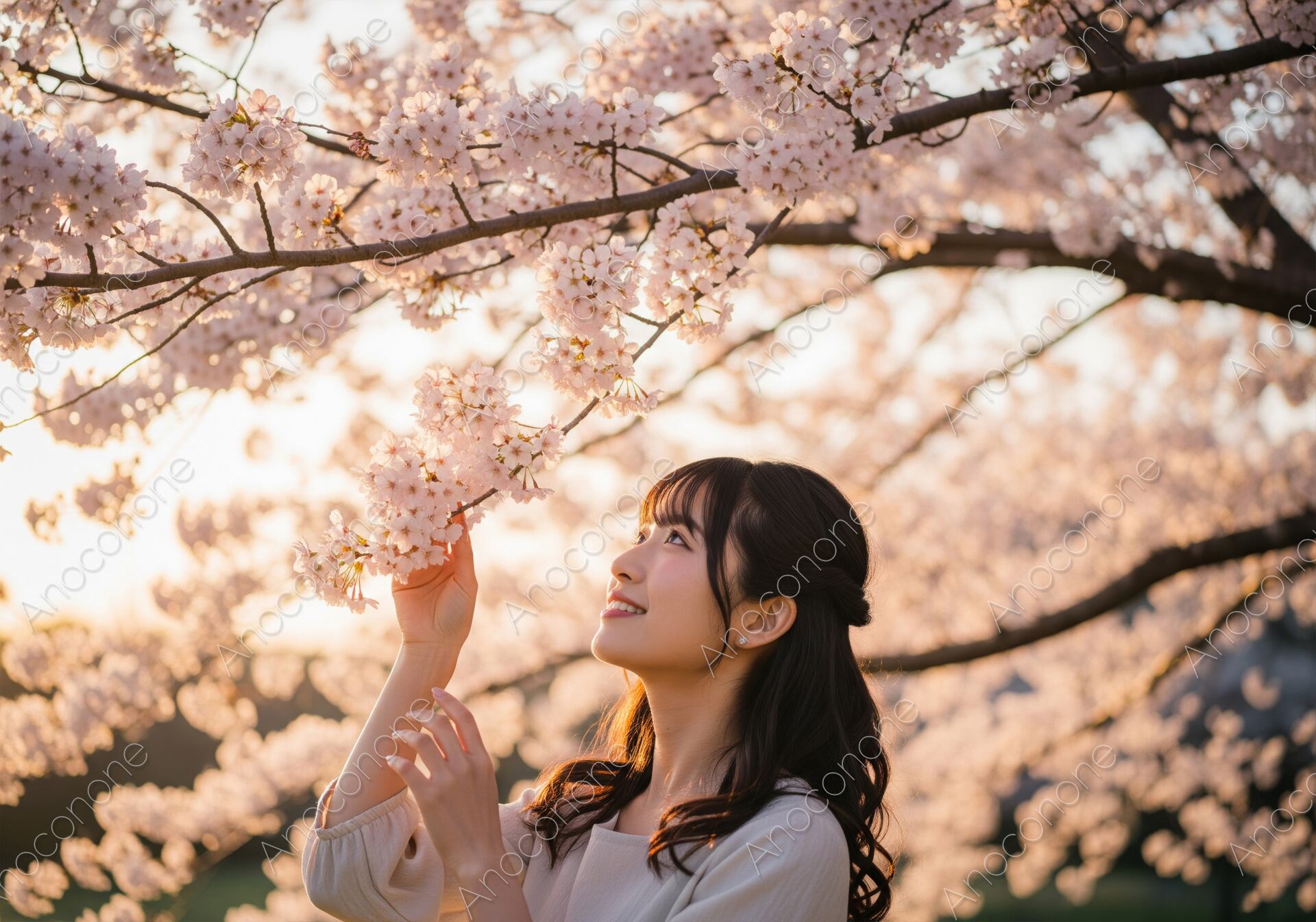 画像素材:満開の桜の下で、夕日の暖かい光を浴びながら、優しく花を見つめて微笑む女性のポートレートです。背景の柔らかなボケと、桜の繊細なピンク色が女性の優美さを引き立てています。春の季節感、喜び、自然の美しさ、ライフスタイルなど、見る人にポジティブで感動的な印象を与えるクリエイティブに最適な一枚です。