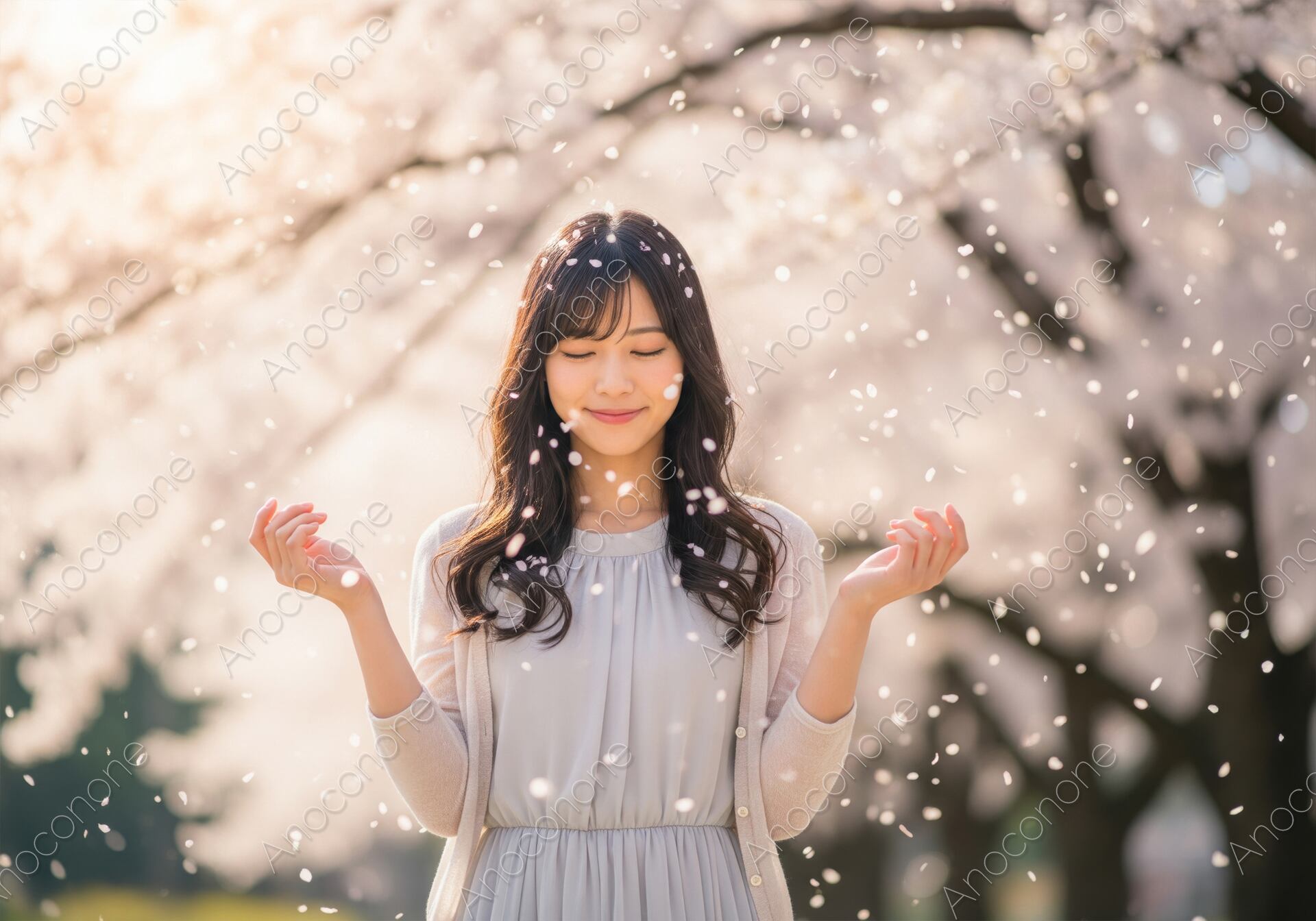 画像素材:満開の桜並木の下、舞い散る花びらの中で両手を広げ目を閉じ、春の息吹を感じている女性のポートレートです。柔らかな日差しと桜の淡いピンクが、優雅で穏やかな雰囲気を作り出しています。美容、健康、ライフスタイルなど、安らぎや自然との調和を表現したいクリエイティブに最適な一枚です。