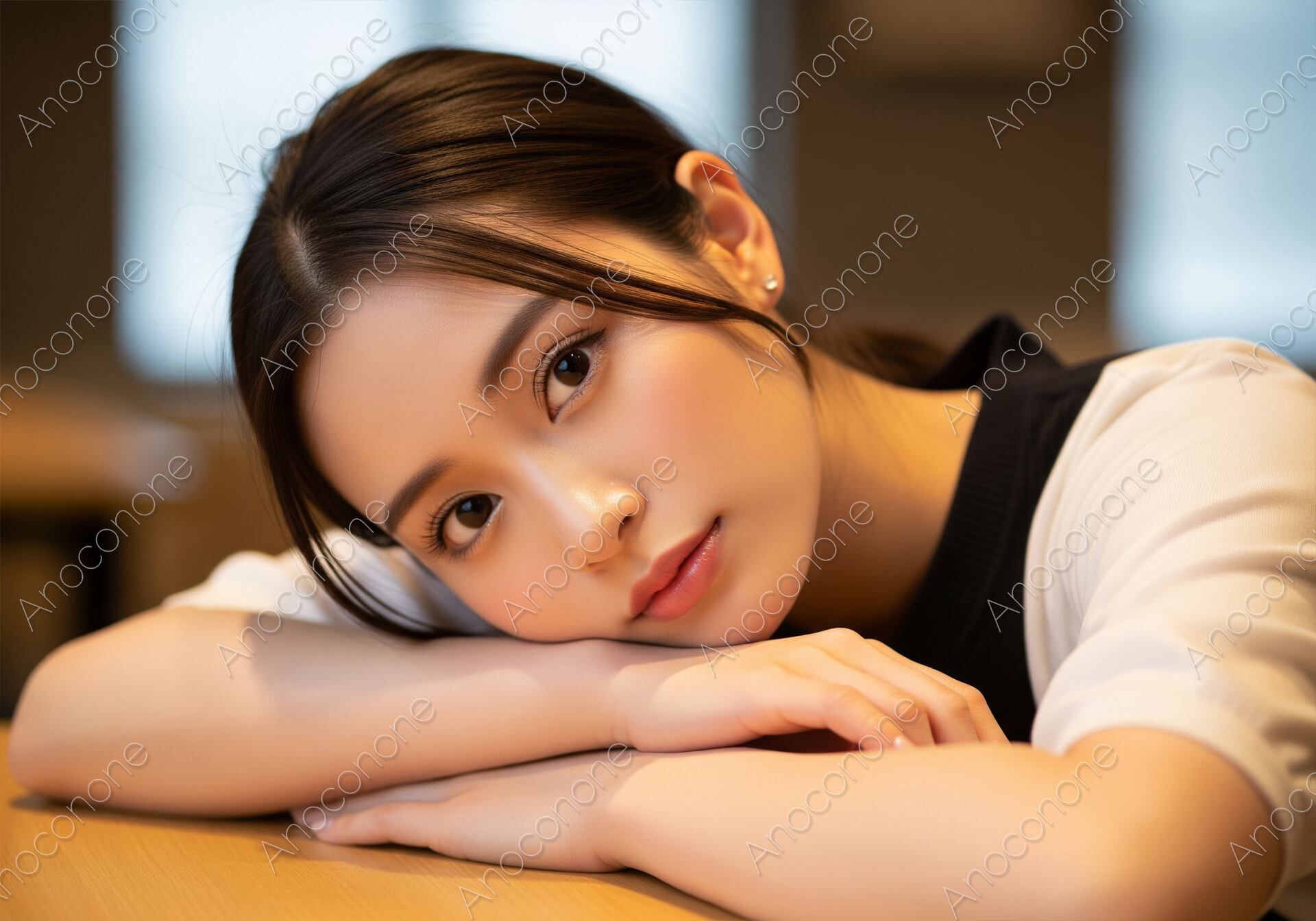 画像素材:明るい室内のデスクにうつ伏せになり、静かにこちらを見つめる女性のクローズアップポートレートです。端正な顔立ちと、目の潤いが印象的で、どこか物思いにふけるような表情が魅力的です。ビジネス、美容、内省、休憩、ライフスタイルなど、静かで落ち着いた雰囲気を出したいクリエイティブに最適な一枚です。
