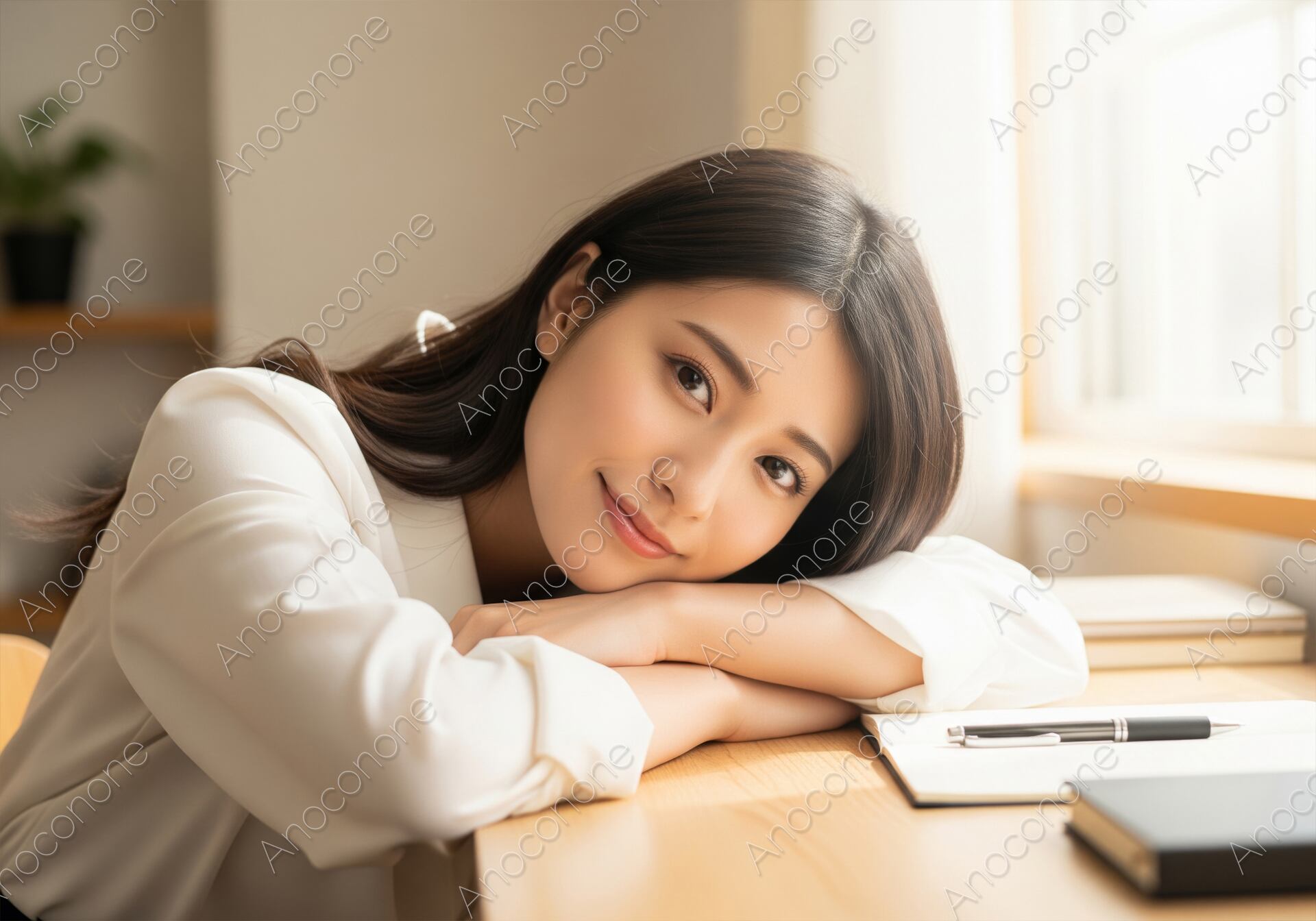 画像素材:窓から柔らかな自然光が差し込むデスクで、うつ伏せになり優しく微笑む女性のポートレートです。白いジャケット姿が清潔感と知的な印象を与え、リラックスした表情が親しみやすさを感じさせます。ビジネス、休憩、美容、ライフスタイル、またはポジティブなオフィスシーンのクリエイティブに最適な一枚です。