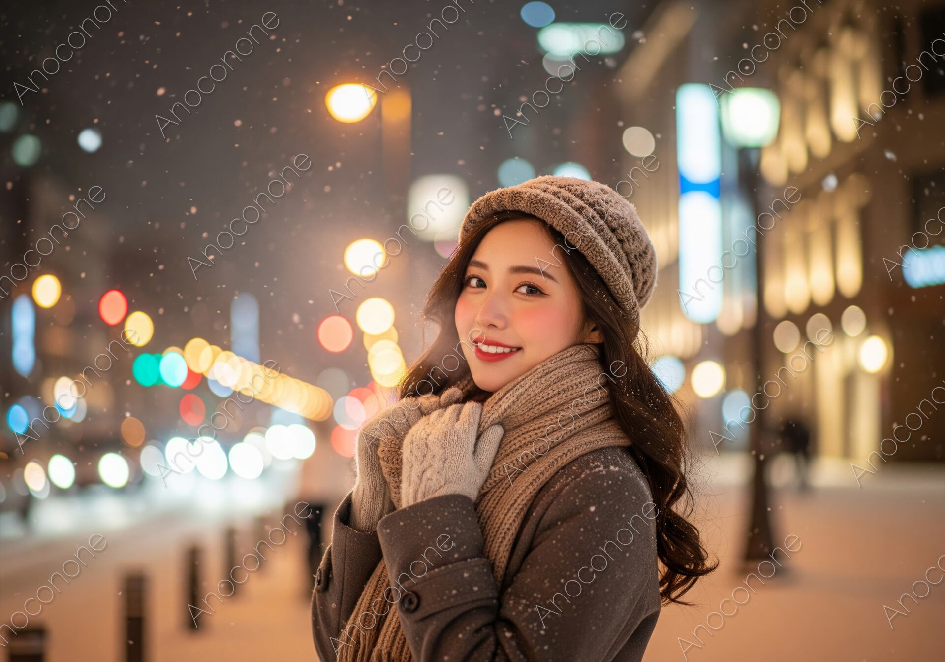 画像素材:雪が舞い落ちる冬の夜、街の明かりがキラキラと輝く背景の前で、暖かそうなニット帽とマフラーを身に着けて優しく微笑む女性のポートレート素材です。温かい冬のファッションと、冷たい雪のコントラストが魅力的で、冬の季節感や都会的なロマンスを表現したい広告、ウェブサイト、旅行関連のコンテンツなどに最適です。