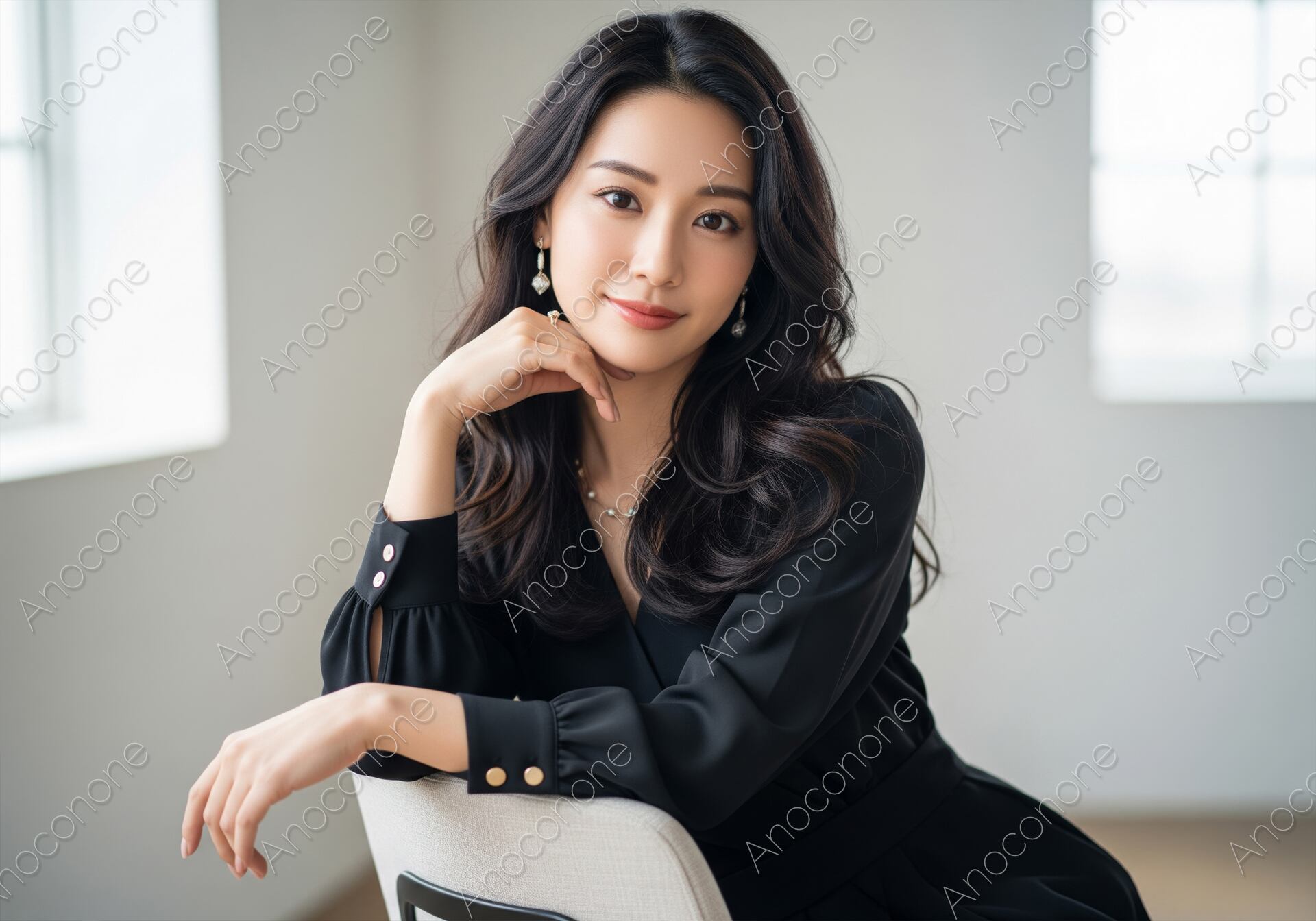 画像素材:シンプルでモダンな空間で、黒いワンピースを着用し、椅子に優雅に座りながら頬に手を添えてカメラを見つめる女性のポートレート素材です。洗練された大人の魅力と自信を感じさせる表情が印象的です。高級感のあるファッション、ビジネス、またはエレガントなライフスタイルをテーマにした広告やウェブコンテンツに最適です。