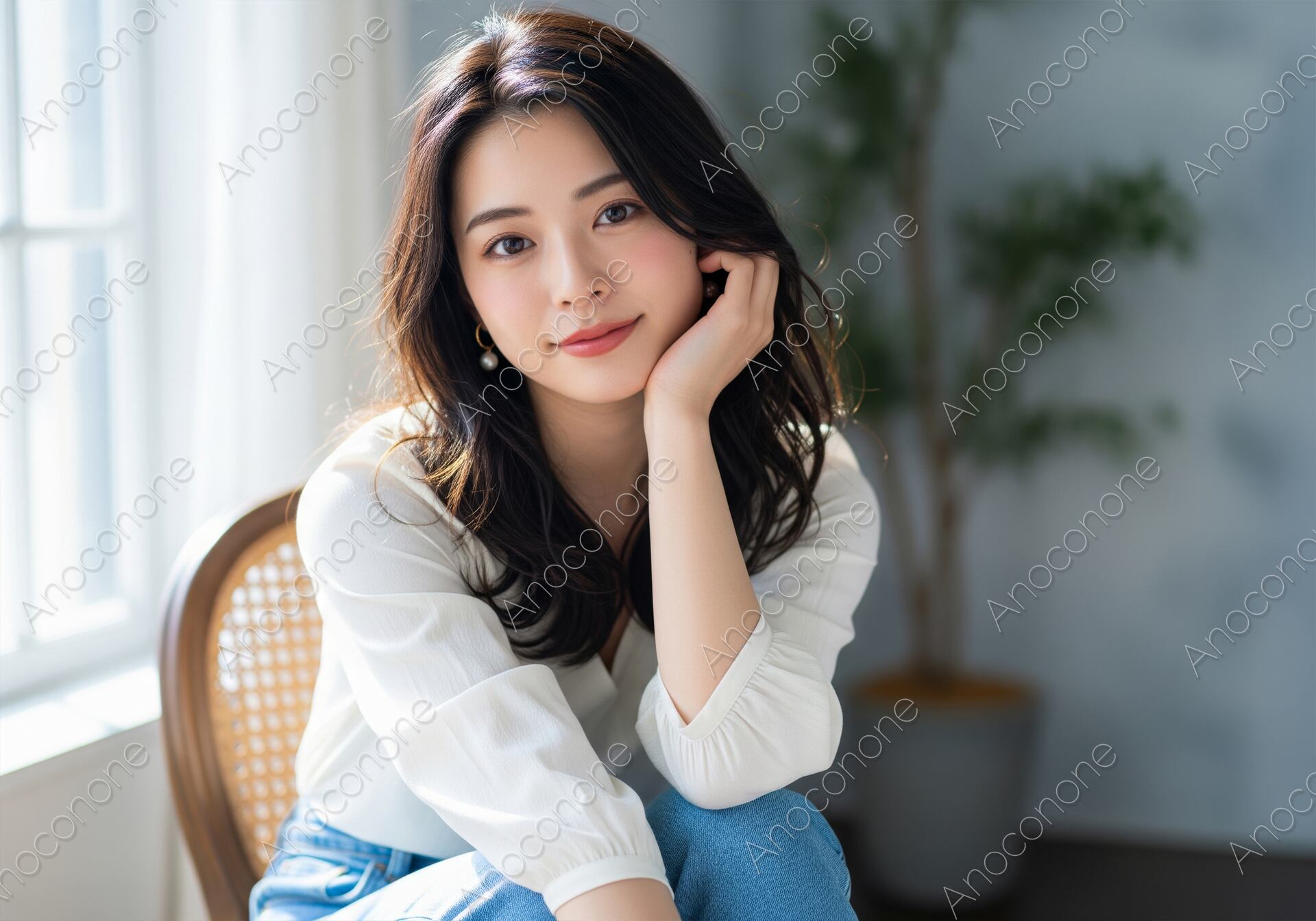 画像素材:窓から差し込む柔らかな光の中で、ラタン素材の椅子に座り、頬に手を添えてカメラに微笑みかける女性のポートレート素材です。白シャツとジーンズの爽やかなカジュアルスタイルが、リラックスした心地よい日常の雰囲気を醸し出しています。ライフスタイル、ファッション、ビューティ、または健康関連のコンテンツで、明るく親しみやすいビジュアルを求める方に最適です。