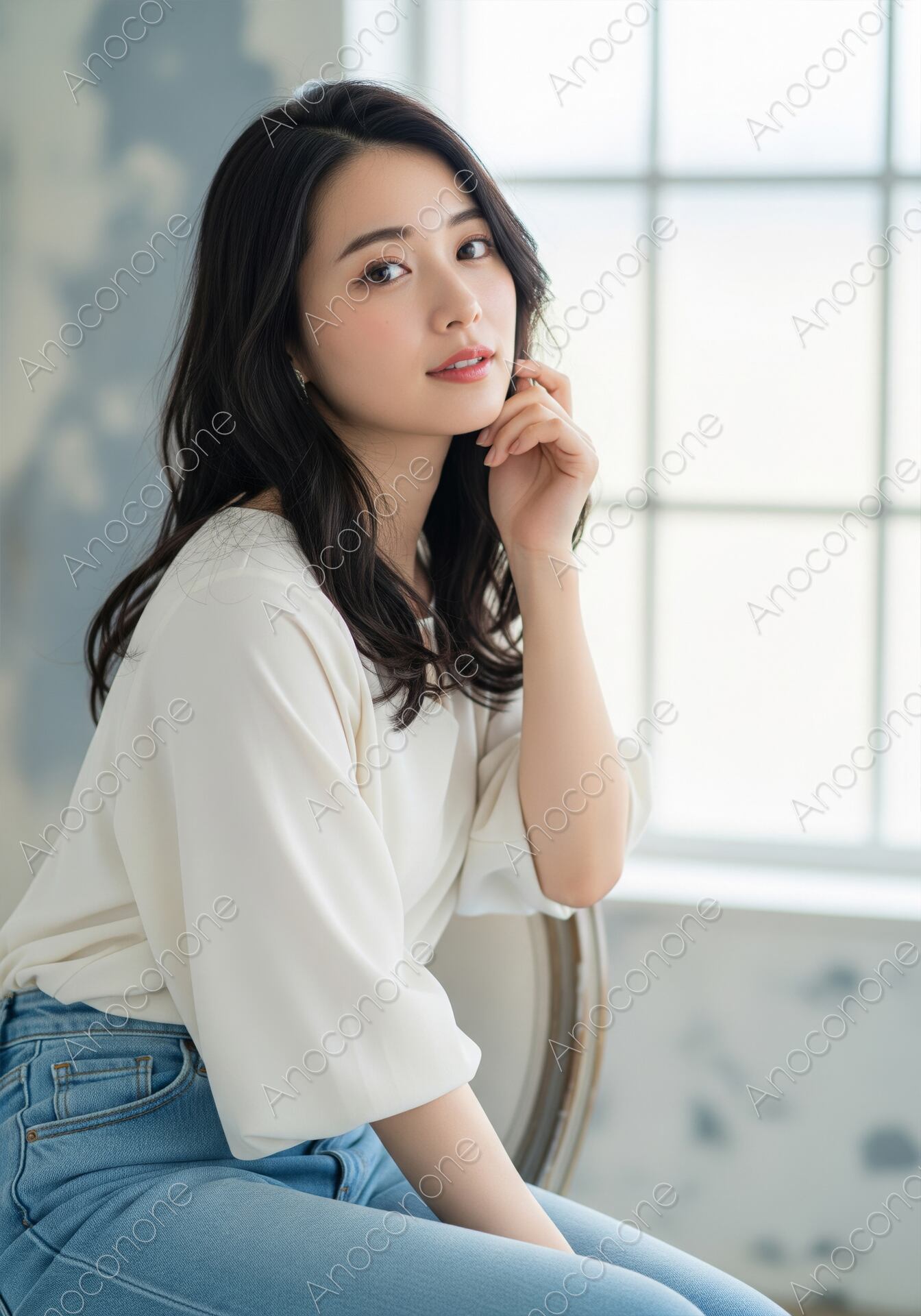 画像素材:窓から差し込む自然光の中で、白いブラウスとジーンズのカジュアルな装いで椅子に座り、カメラをじっと見つめる女性のポートレート素材です。頬に添えられた手が、落ち着きと優雅な雰囲気を醸し出しています。ファッション、ビューティ、ライフスタイル、またはナチュラルな雰囲気の広告やウェブデザインなど、幅広いコンテンツに活用できる魅力的なビジュアルです。