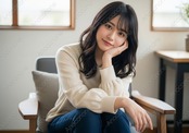 画像素材:明るい屋内空間で、ゆったりとしたニットとジーンズ姿で木製のアームチェアに座り、頬杖をついて優しく微笑む女性のポートレート素材です。リラックスした穏やかな表情が、心地よい日常や休息の時間を表現しています。ライフスタイル、インテリア、ヘルスケア、または家庭でのくつろぎをテーマにした広告やウェブコンテンツに最適です。