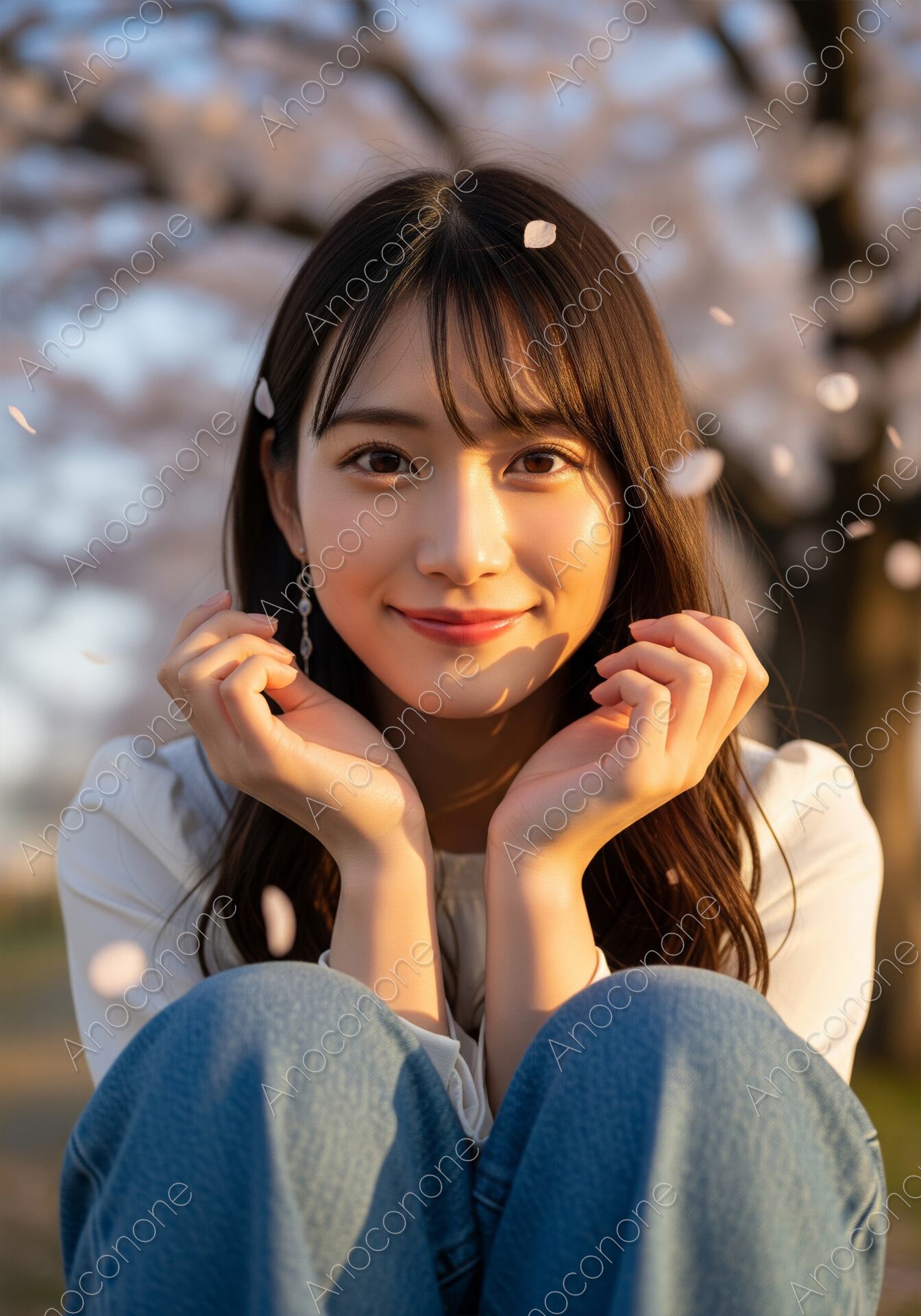 画像素材:桜の花びらが舞い散る中で、両手を顔の横に添え、優しく微笑む女性のクローズアップポートレート素材です。夕方の柔らかな日差しが女性の表情を照らし、春の温かく幻想的な雰囲気を強調しています。季節のキャンペーン、ビューティ、ライフスタイル、または春の喜びをテーマにした広告やウェブデザインに最適な魅力的なビジュアルです。
