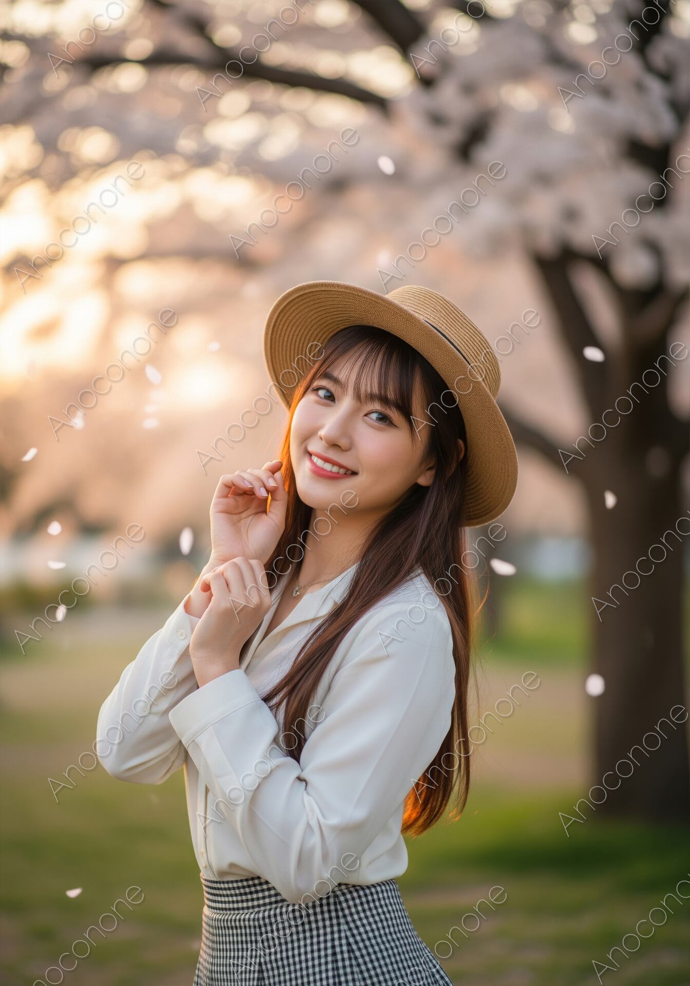 画像素材:桜の花びらが舞い散る中で、麦わら帽子と白シャツ、チェックスカート姿で優しく微笑む女性のポートレート素材です。夕方の温かい光に包まれ、春のピクニックやデートを連想させる爽やかで可愛らしい雰囲気が魅力です。春のファッション、イベント、旅行、ライフスタイル関連の広告やウェブデザインに最適です。
