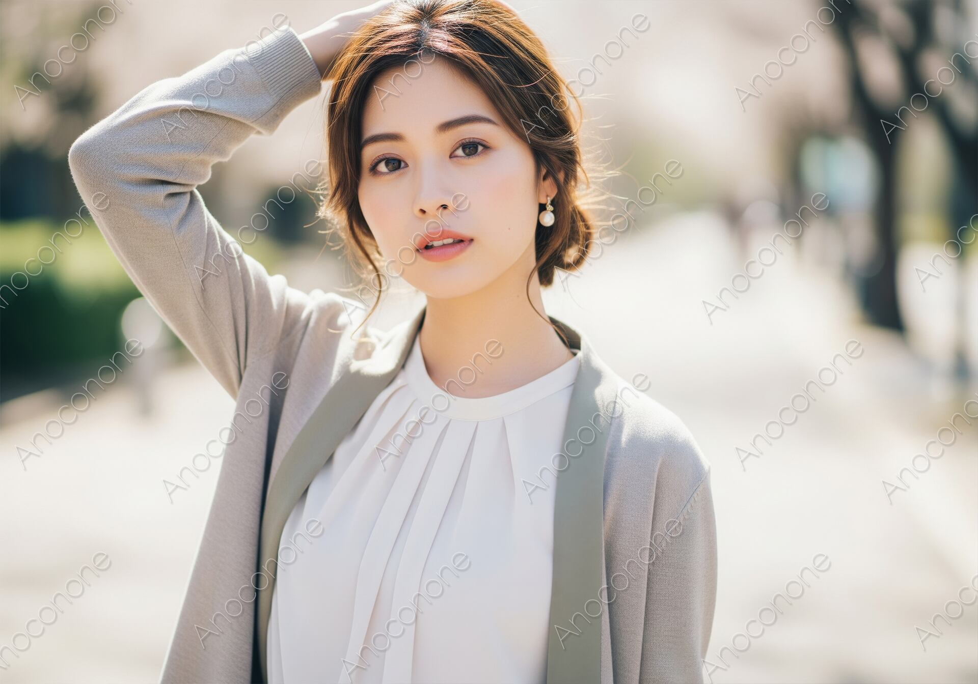 画像素材:明るい日差しの下、並木道で髪に手を添えながらカメラを見つめる女性のポートレート素材です。淡いカーディガンと白のブラウスという爽やかな春のファッションが、心地よい季節感を表現しています。ファッション、ビューティ、ライフスタイル、または春のイベントや広告など、幅広い用途で活用できる魅力的なビジュアルです。