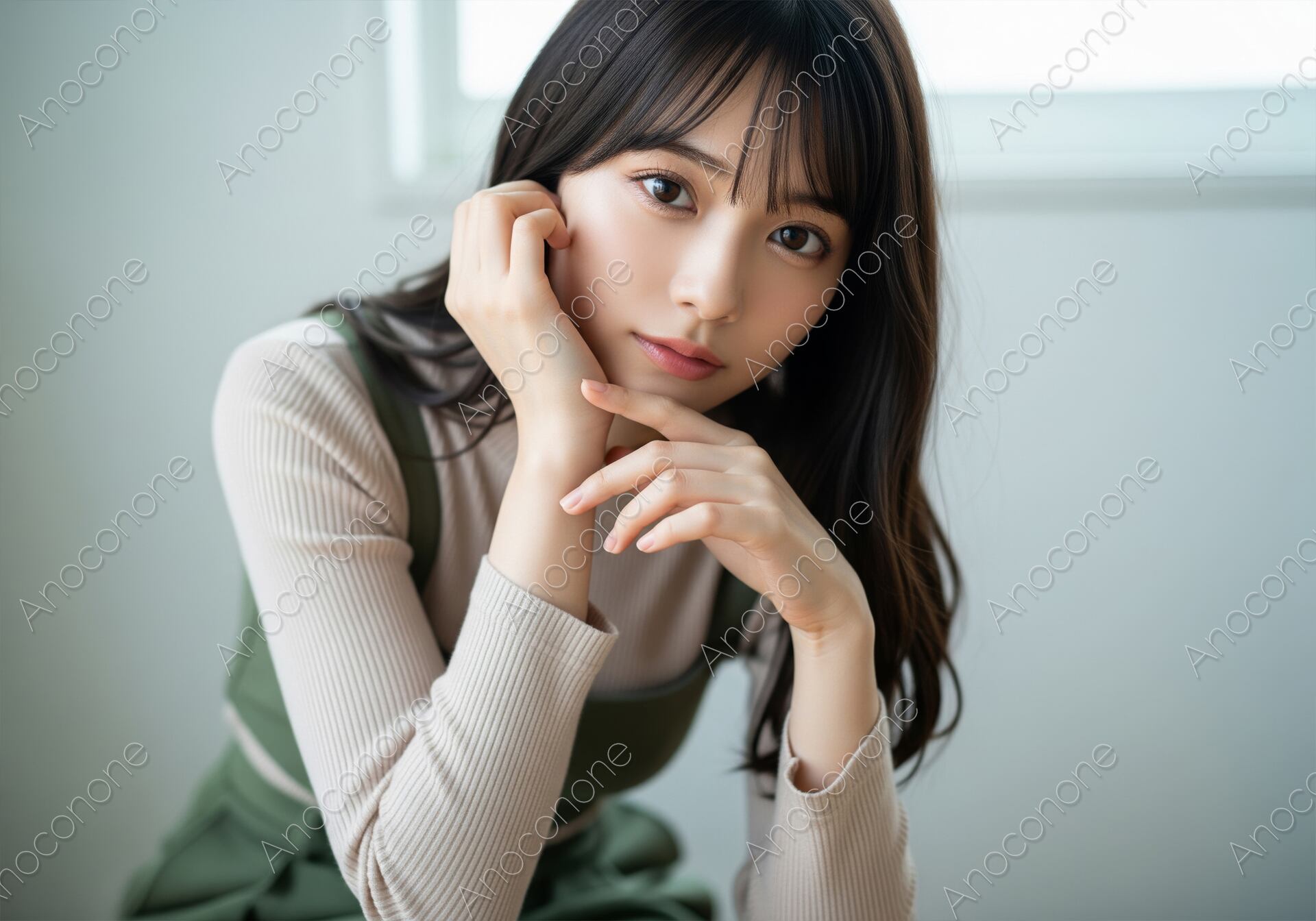 画像素材:明るい窓際で、グリーンのキャミソールワンピースとリブニットのトップスを着用し、頬に手を添えてカメラを真剣に見つめる女性のクローズアップポートレート素材です。洗練されたファッションとクールな表情が、知的でスタイリッシュな雰囲気を醸し出しています。ファッション、ビューティ、ライフスタイル関連のビジュアル素材として理想的です。