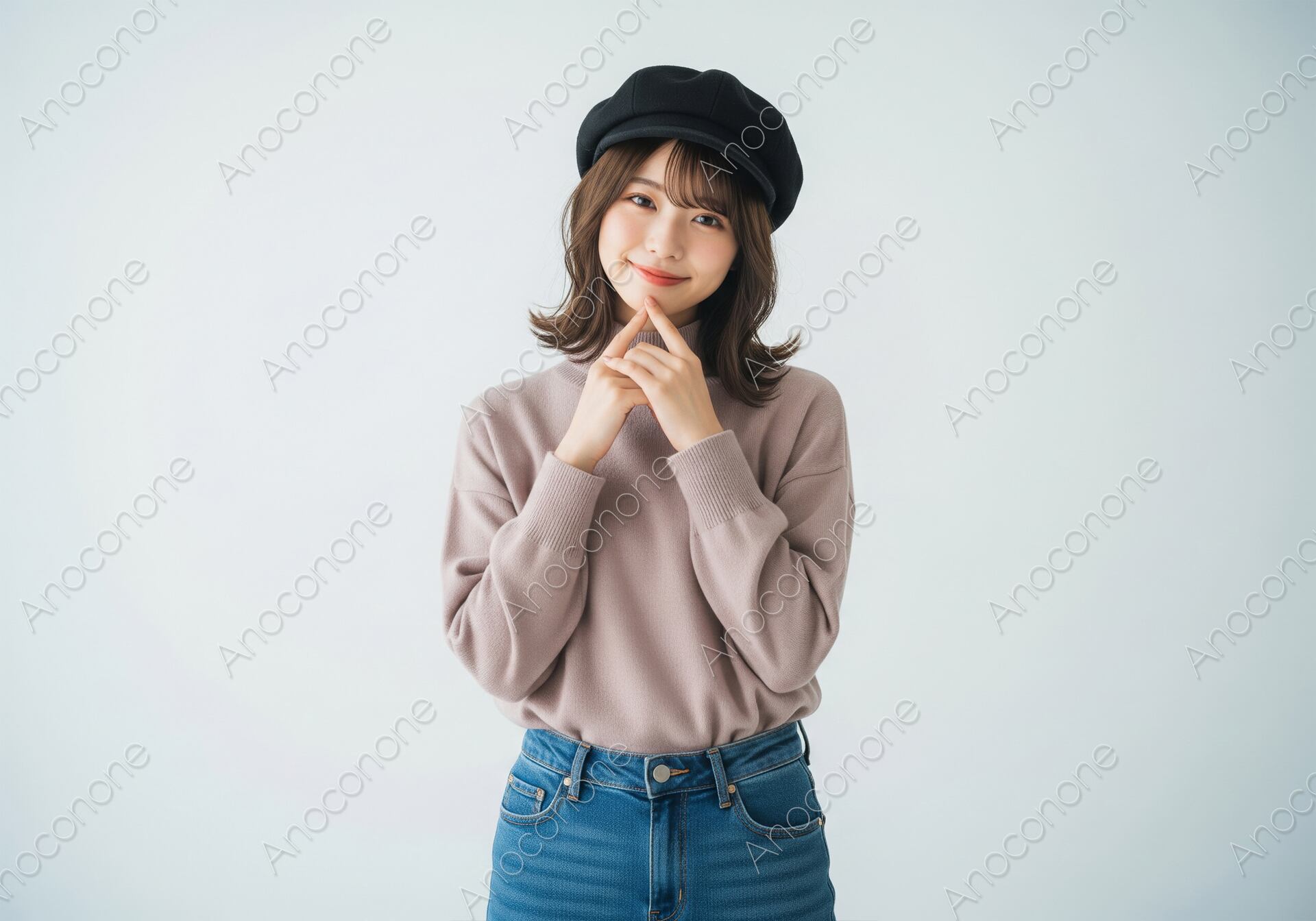 画像素材:白背景のスタジオで、淡いピンクのタートルネックニットとジーンズを合わせたカジュアルなファッションの女性の画像です。指を口元に添えたポーズと上目遣いが可愛らしい印象を与えます。アパレル製品のイメージカットや、ライフスタイルを提案するウェブサイト、SNSでのカジュアルファッション紹介にご活用いただけます。