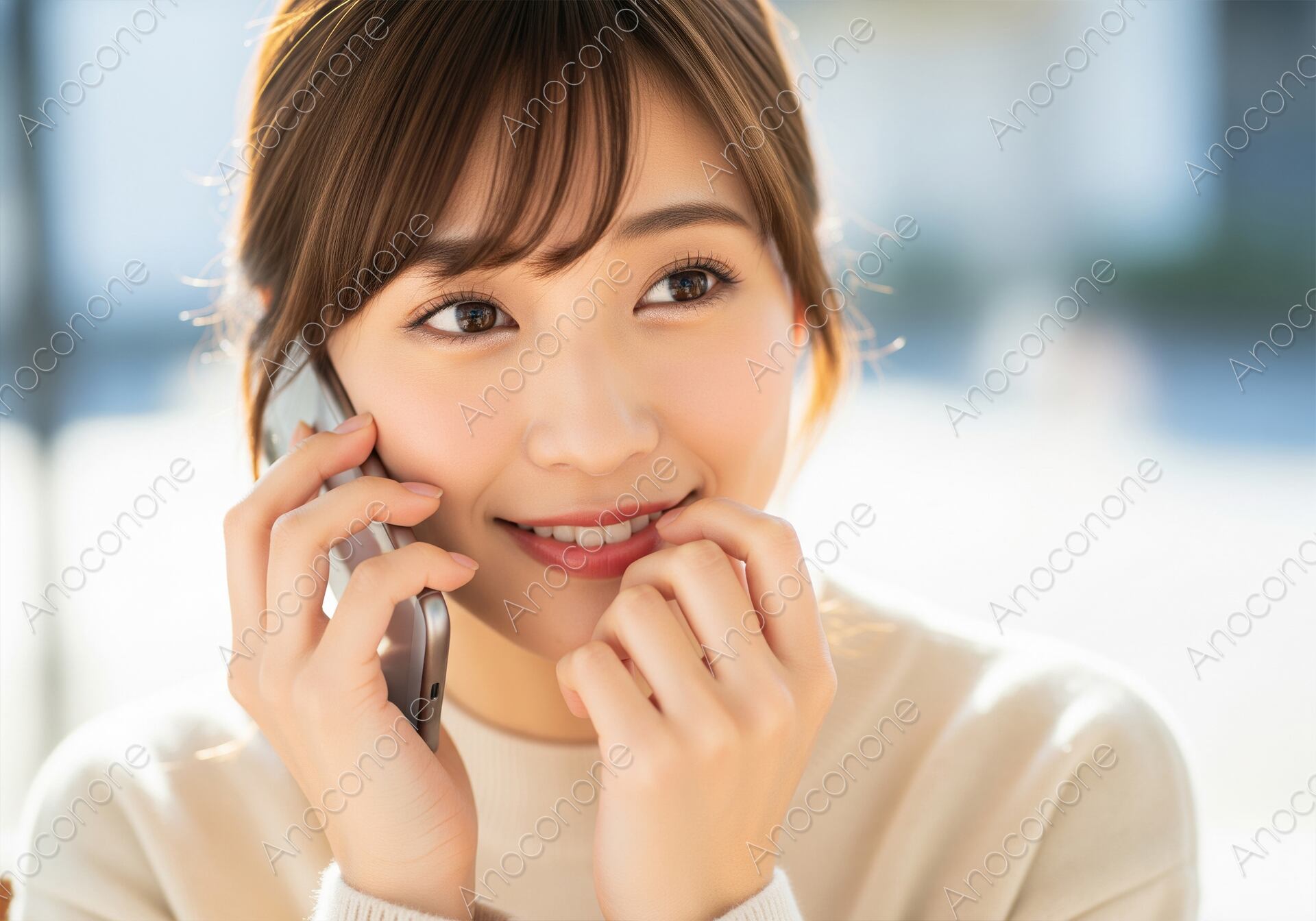 画像素材:窓から差し込む明るい光を浴びながら、スマートフォンで楽しそうに会話している、親しみやすく魅力的な女性のクローズアップです。輝く笑顔と、口元に手を添える仕草が、前向きで活発なコミュニケーションの様子を表現しています。ビジネス、通信、サービス業、ライフスタイル関連のウェブサイトや広告素材に最適です。
