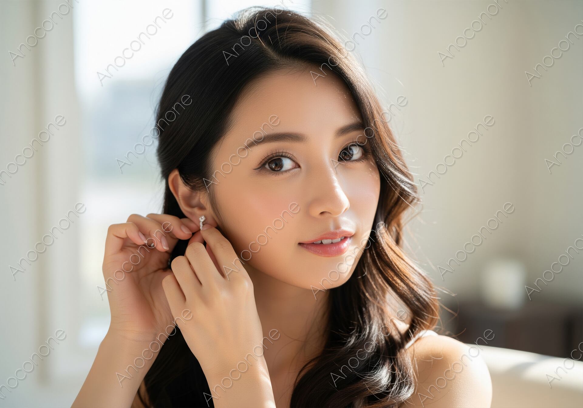 画像素材:柔らかい自然光が当たる場所で、輝くイヤリングを身につける女性の優雅な瞬間を捉えました。ビューティー、ファッション、ジュエリー、コスメ関連の広告やウェブサイトに最適な、清潔感と上品さを兼ね備えた魅力的な一枚です。