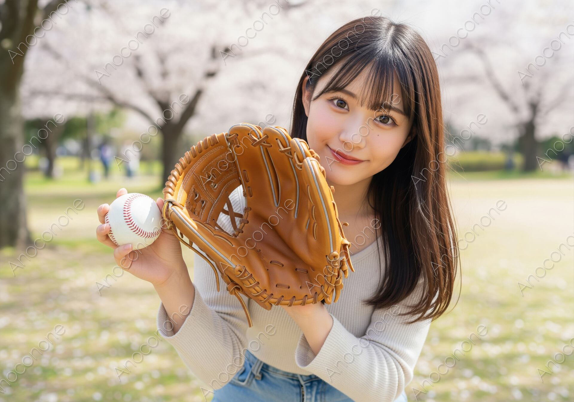 画像素材:満開の桜の木の下、野球のグローブとボールを手に持ち、明るく微笑む女性を捉えました。スポーツやレジャー、春の公園での楽しい時間を表現するのに最適です。健康的なイメージやアクティブなライフスタイルを伝えたいプロモーションにご活用いただけます。