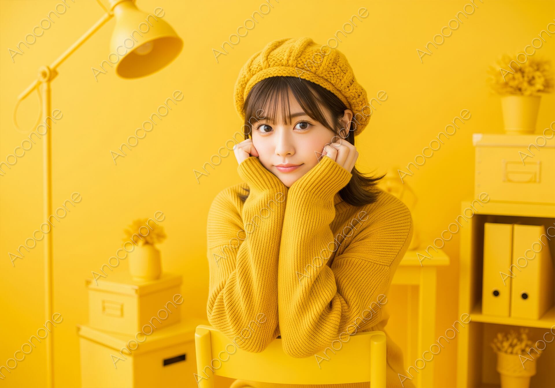 画像素材:鮮やかなイエロー一色の部屋で、同色のニット帽とセーターを着て座る女性を捉えました。ポップで明るく、視線を引きつけるインパクトのあるビジュアルです。ファッション、アパレル、広告、ウェブサイトのキービジュアルとして最適です。