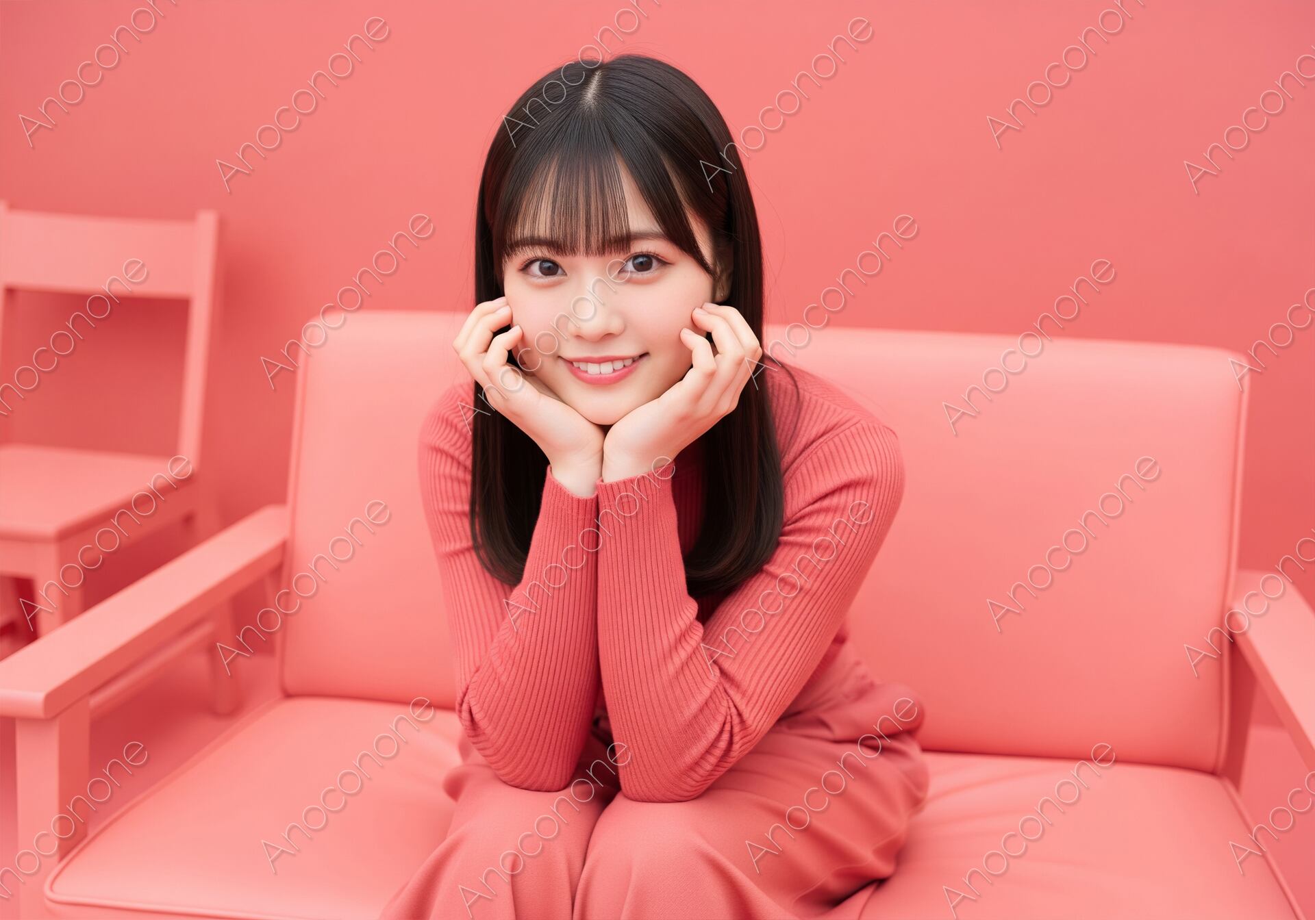 画像素材:鮮やかな赤(コーラルピンク)で統一された空間のソファに座り、両手を頬に当てて可愛らしく微笑む女性を捉えました。ポップで目を引くビジュアルは、ファッション、コスメ、エンターテイメントなど、華やかでポジティブなイメージを伝えたい広告に最適です。