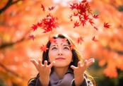 画像素材:鮮やかな紅葉の木の下で、舞い落ちるもみじの葉を舞い上げる女性の幻想的な瞬間を捉えました。秋の旅行、レジャー、季節の移ろいを感じさせる広告素材として最適です。温かみのある色彩と女性の表情が魅力的な一枚です。