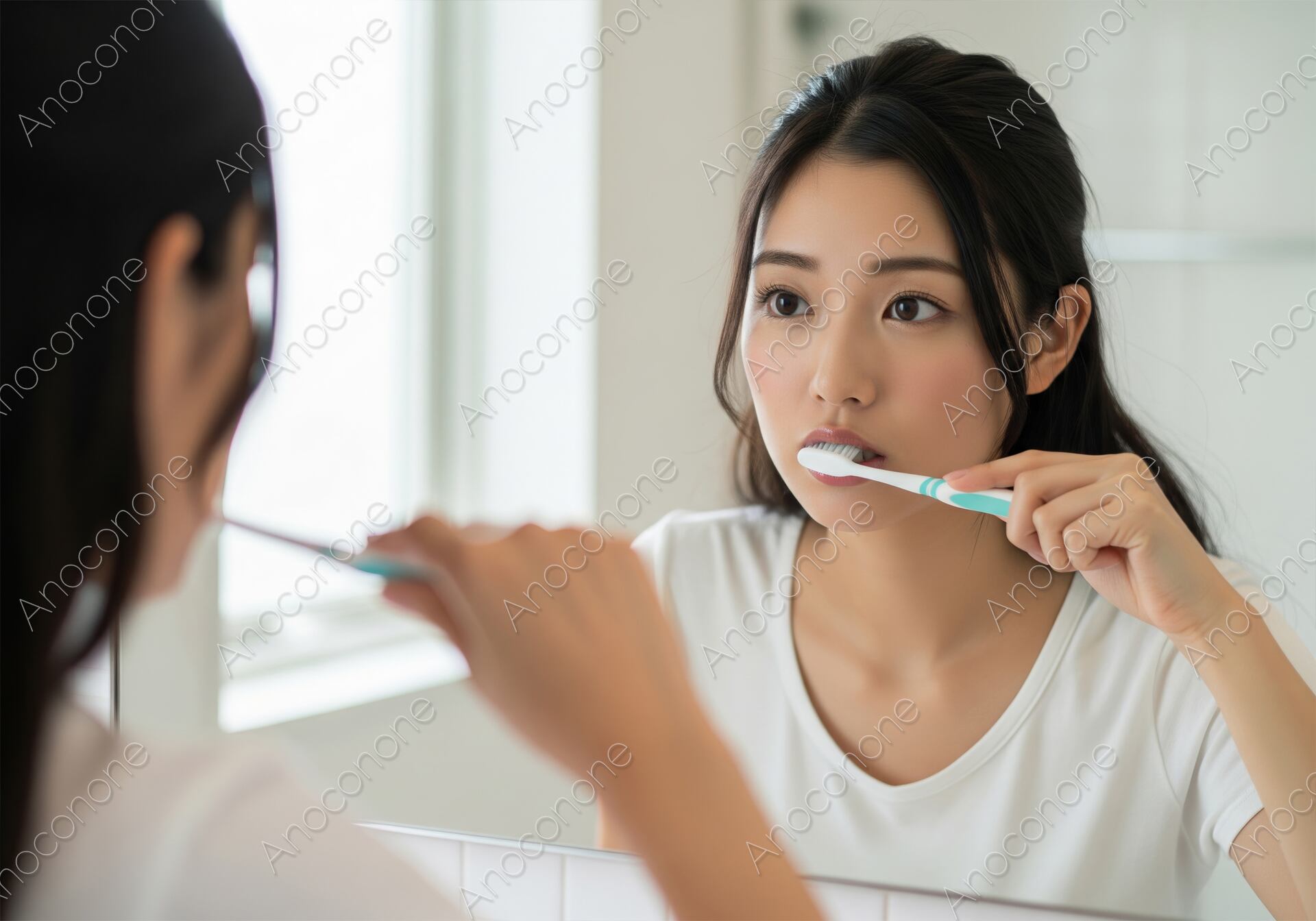 画像素材:明るい洗面所で鏡越しに、真剣な表情で丁寧に歯磨きをする女性の姿を捉えました。オーラルケアやヘルスケア、美容関連の広告素材として最適です。清潔感あふれる空間と女性の真面目な表情が、商品の信頼感を高めます。
