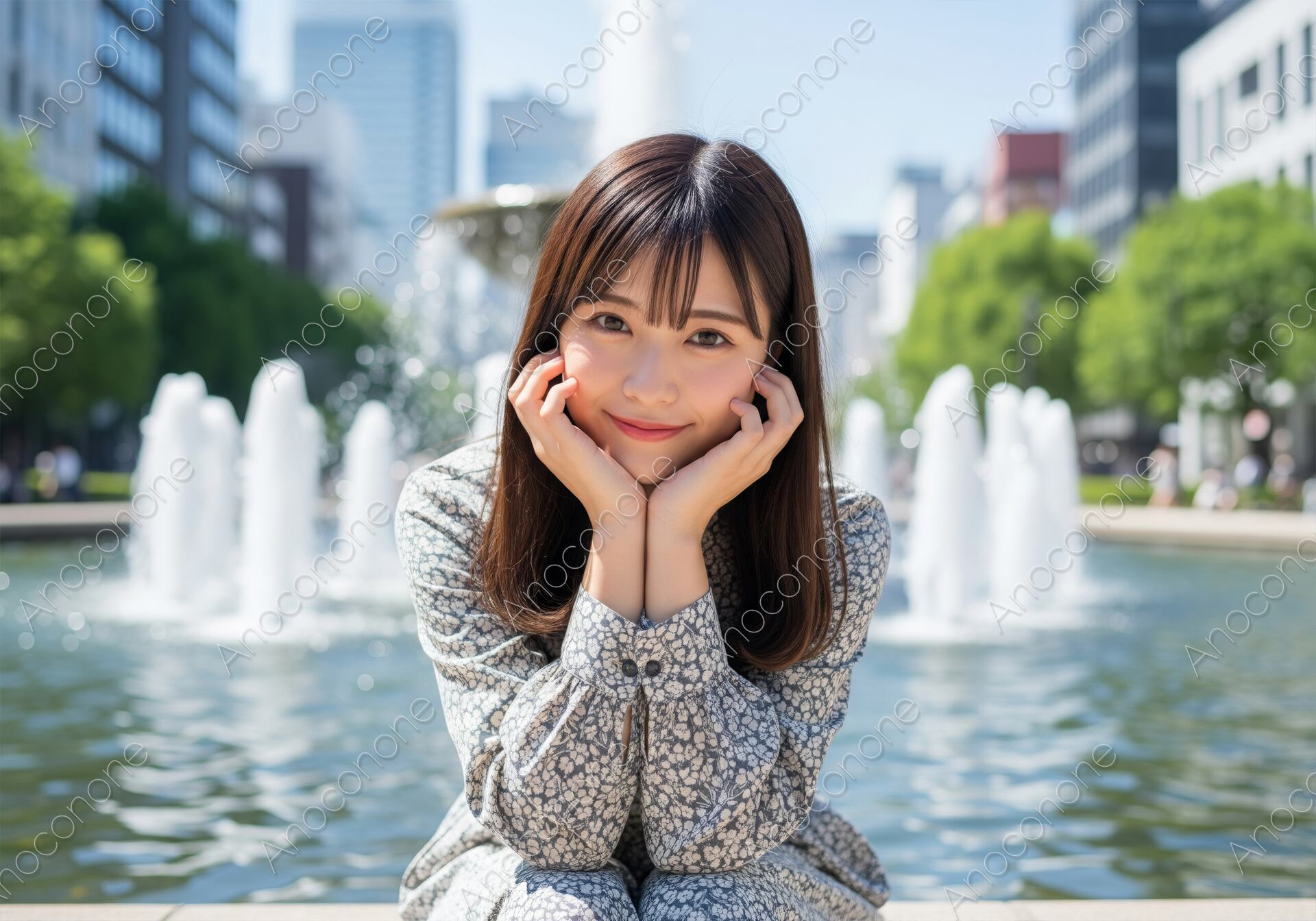 画像素材:都会の噴水広場で、水しぶきと緑を背景に、両手を頬に当てて可愛らしく微笑む女性を捉えました。都会的な背景と自然な笑顔が融合し、ライフスタイル、レジャー、ファッション関連の広告素材として最適な、明るく爽やかな一枚です。