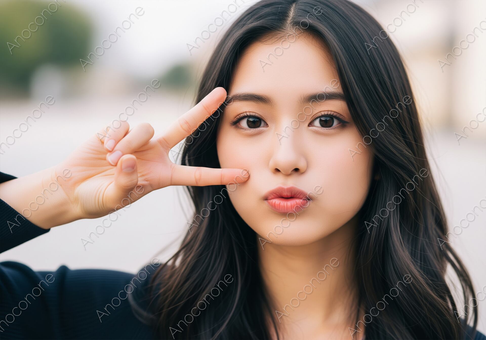 画像素材:カメラに向かって、指でピースサインを作り、少し口を尖らせたキュートな表情を見せる女性をクローズアップで捉えました。若者向けの広告、SNS、ライフスタイル関連のコンテンツに最適な、親しみやすく魅力的なビジュアルの一枚です。