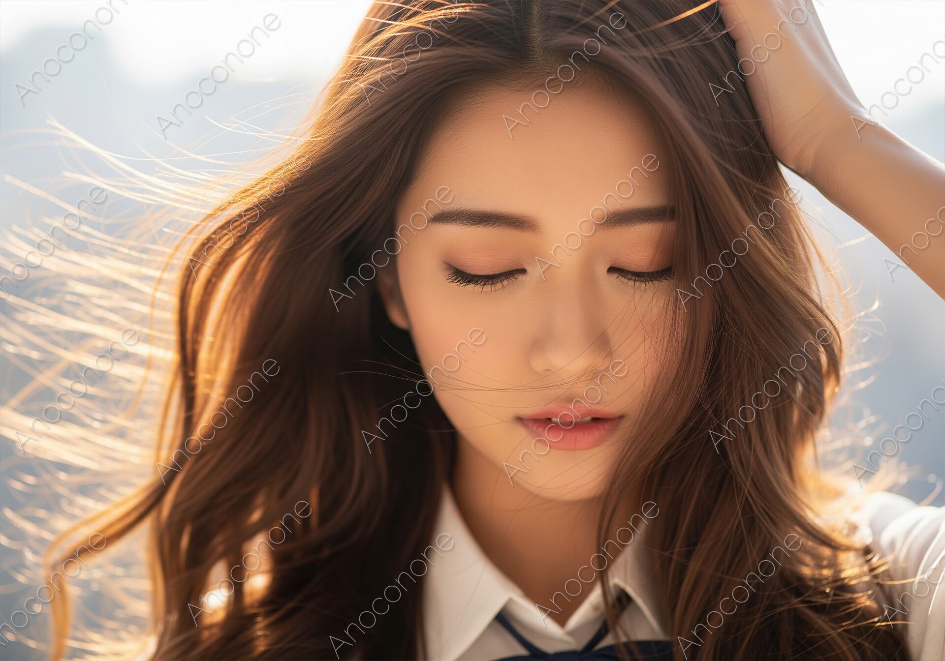 画像素材:風に美しくなびく髪が印象的な女性のクローズアップ画像です。柔らかな光が髪の毛や肌を包み込み、透明感と上品な雰囲気を際立たせています。目を閉じた表情は、安らぎや思索的なムードを表現し、ヘアケア製品、化粧品、美容、ファッション関連の広告や、内面的な美しさをテーマにしたコンテンツなどに最適な、魅力的で上質な素材です。