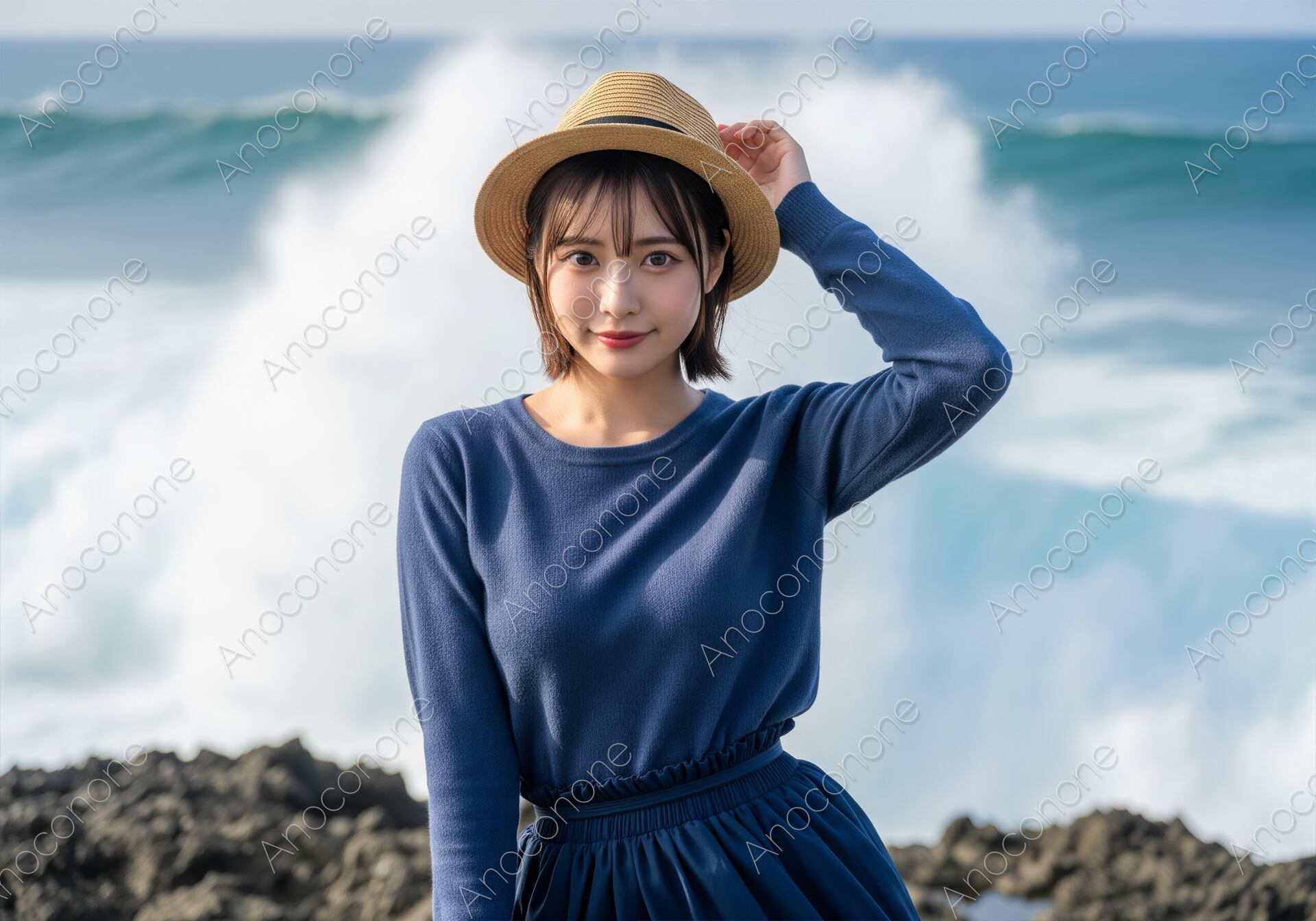 画像素材:ダイナミックな波が砕ける海を背景に、麦わら帽子に手を添え、明るい笑顔を見せる女性の画像です。紺色のトップスとスカートが、青い海の色と調和し、カジュアルながらも洗練された印象を与えます。旅行、レジャー、アウトドア、ファッション、ライフスタイル関連の広告や、アクティブで爽快なイメージを訴求したい媒体に最適な素材です。