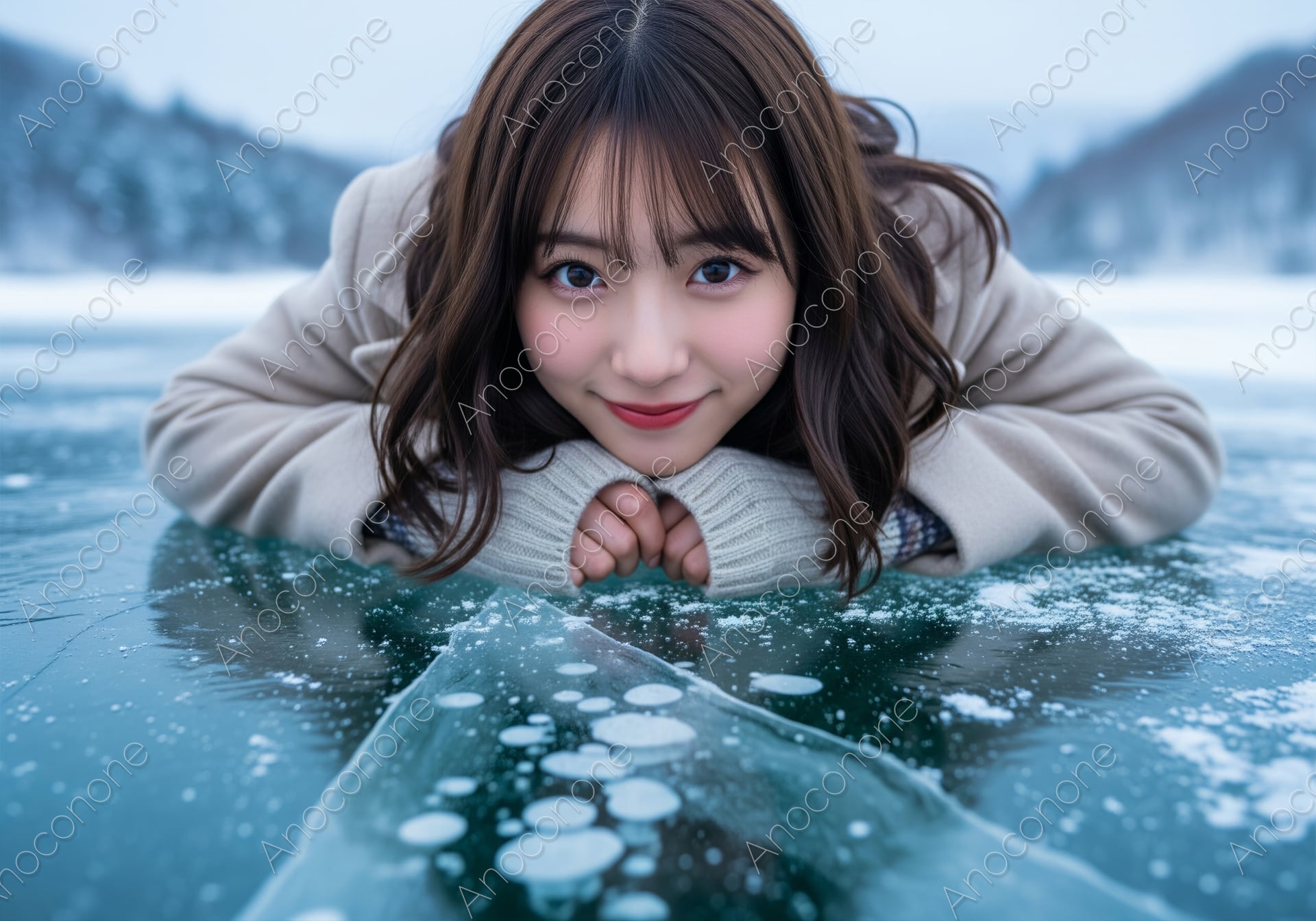 画像素材:凍った湖面にうつ伏せになり、潤んだ瞳でカメラを見つめる女性のクローズアップ画像です。凍った水面に映る姿が幻想的で、冬の澄んだ空気感と女性の持つ可憐な美しさが際立っています。冬の旅行、ライフスタイル、ファッション、化粧品、美容関連の広告や、冬の特集記事などで、温かさと透明感を訴求したい媒体に最適な素材です。