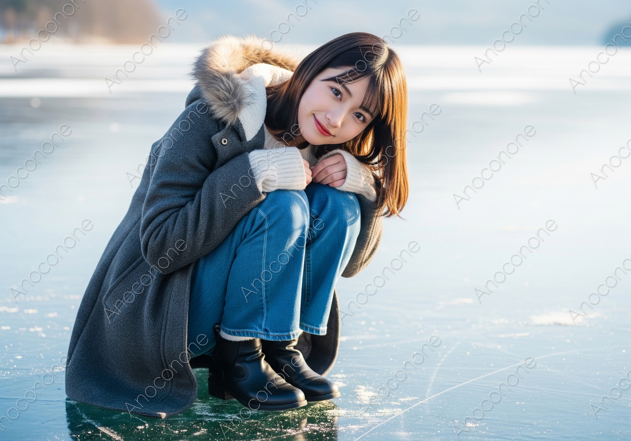 画像素材:冬の澄んだ光が降り注ぐ凍った湖面の上で、暖かそうなコートを着てしゃがみこみ、穏やかな微笑みを浮かべる女性の画像です。冷たい空気の中にも温かさを感じる表情と、湖面の反射が幻想的な雰囲気を醸し出しています。冬の旅行、ライフスタイル、ファッション、アウトドア、イベント関連の広告や、季節感を出すイメージ素材として最適です。