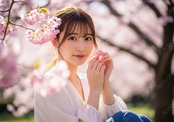 画像素材:春の暖かな日差しと満開の桜の木の下で、カメラに向かって微笑む清楚な雰囲気の女性のアップショットです。鮮やかなピンク色の桜が背景と前景を飾り、春らしい明るく癒される雰囲気を演出しています。Webサイト、広告、パンフレットなど、安心感や幸福感を訴求したいコンテンツに最適な高品質なイメージ素材です。