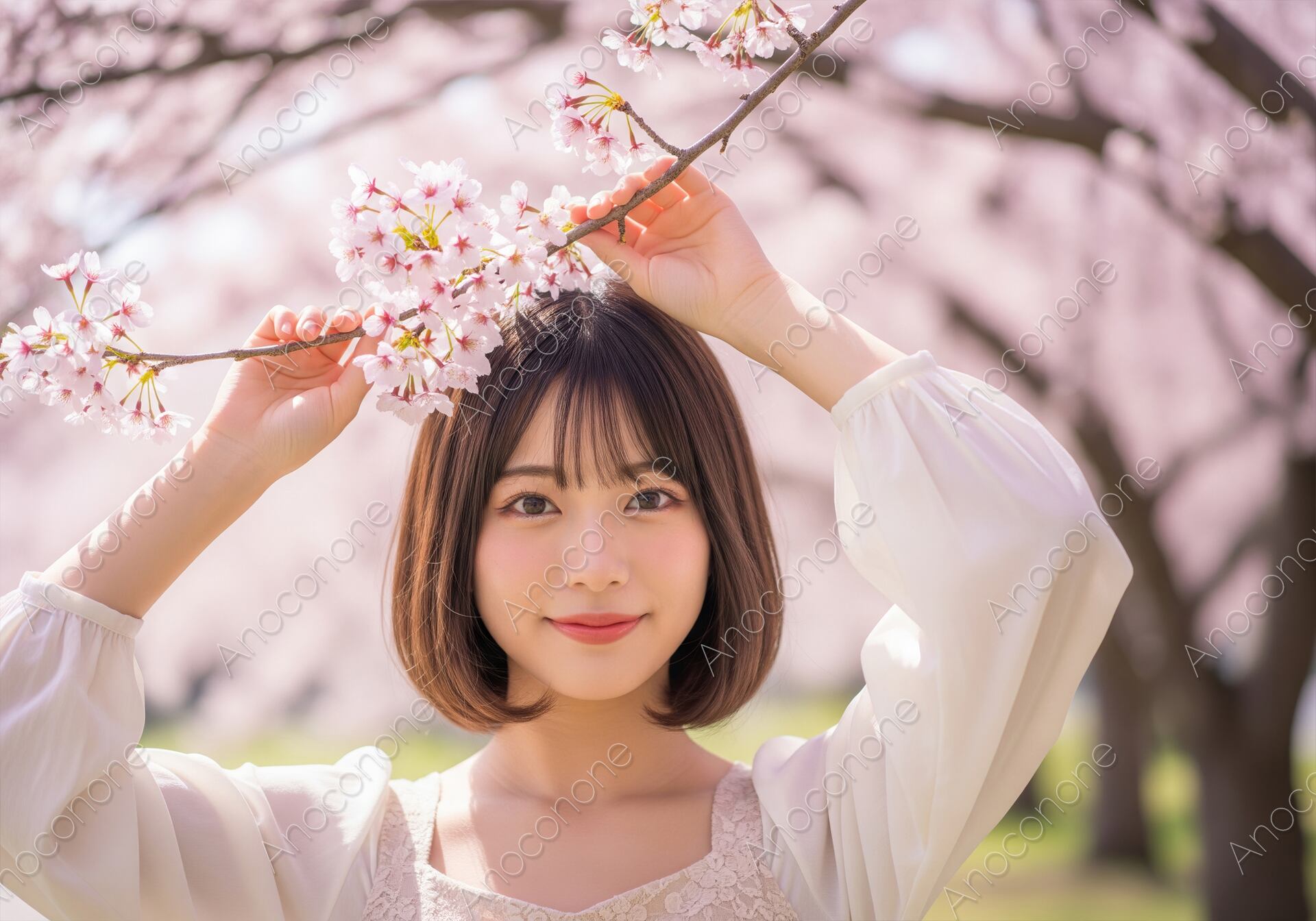 画像素材:満開の桜並木の下、春の優しい光に包まれながら、枝を頭上にかざしてほほ笑むショートヘアの女性を捉えた透明感あふれる一枚。清楚で柔らかな雰囲気は、広告、Webデザイン、雑誌記事など、春の始まりや美容、ライフスタイルをテーマにしたコンテンツに最適です。