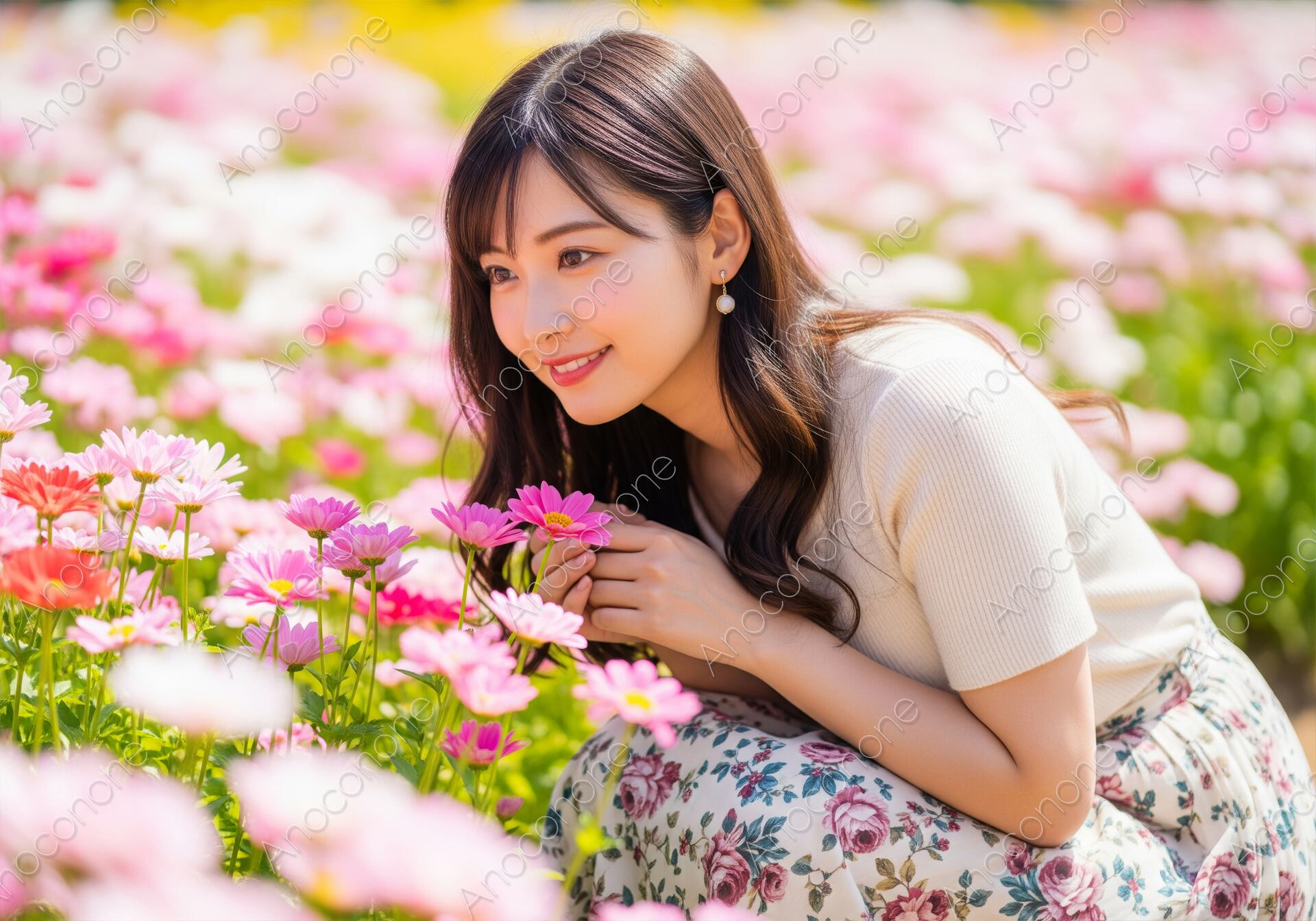 画像素材:穏やかな日差しが降り注ぐピンク色の花畑で、花の香りを楽しみ微笑む若い女性のバストアップポートレート。明るく華やかな色彩とやわらかな表情が、見る人に安らぎと幸福感を与えます。自然で清楚なファッションとメイクは、美容、アパレル、ライフスタイル関連の広告やコンテンツに最適です。
