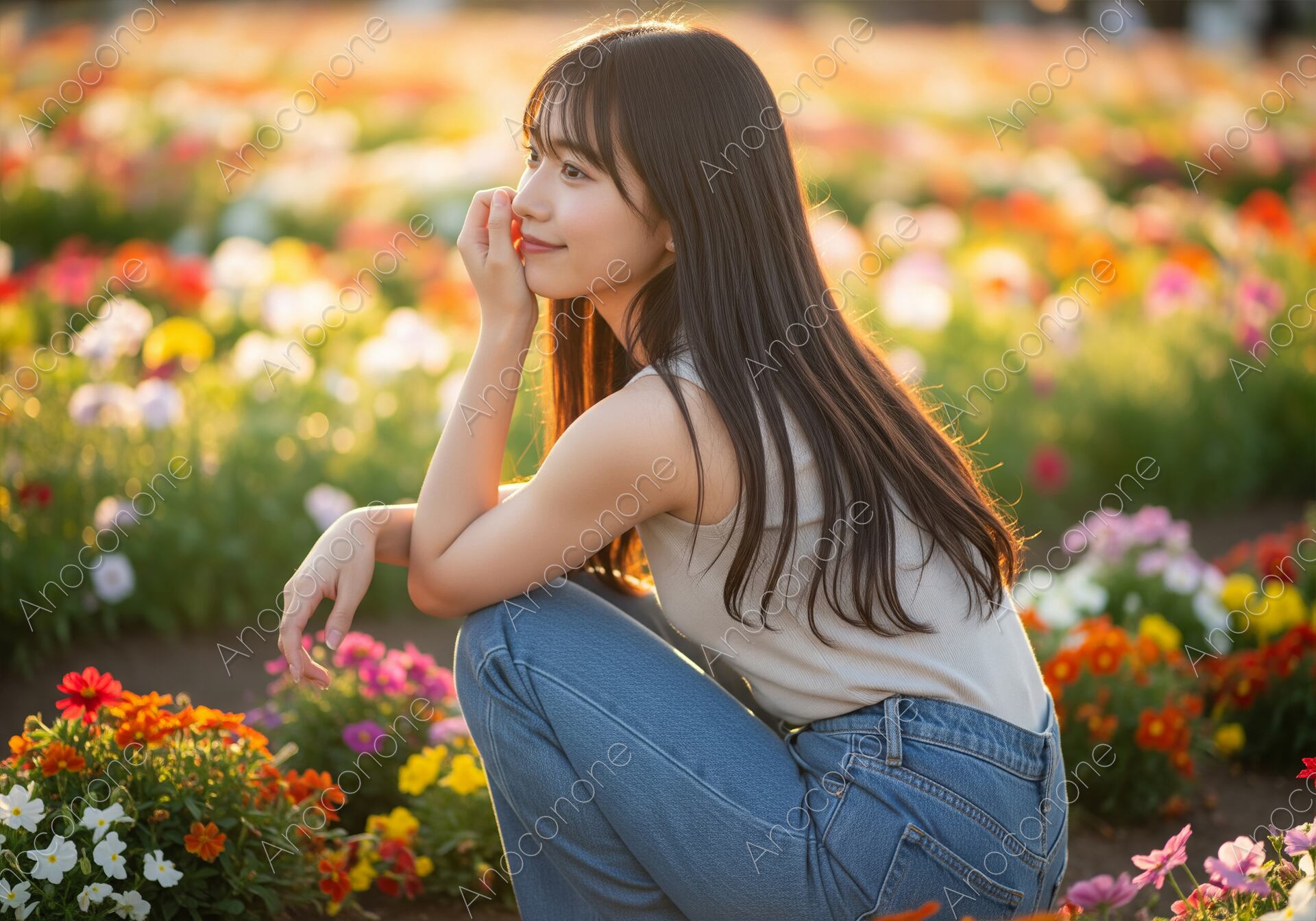 画像素材:夕方の柔らかな日差しが辺りを包み込む美しい花畑で、ベージュのノースリーブとジーンズを着用した若い女性がしゃがみ込み、遠くの景色を見つめながら穏やかな笑顔を浮かべている横顔のポートレートです。希望や未来を感じさせる表情は、ライフスタイル、ファッション、企業サイト、SNSなど幅広く活躍します。