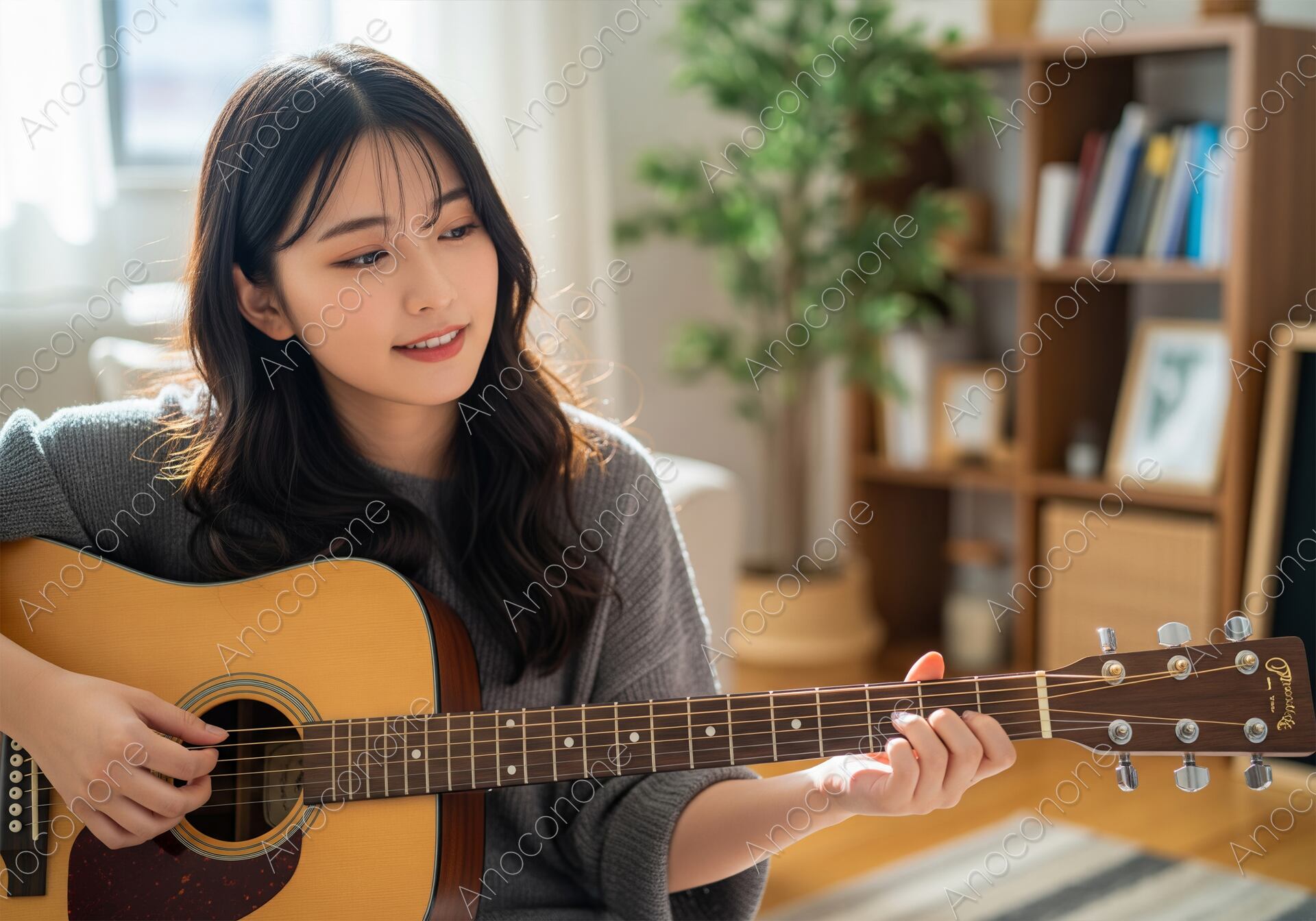 画像素材:明るい日差しが入る心地よい部屋で、アコースティックギターの弦を真剣な眼差しで押さえ、演奏の練習に集中している自然な姿を捉えています。音楽スクールのウェブサイトや趣味の充実を提案するライフスタイル誌、ブログ記事の挿絵に最適です。日常のふとした瞬間の美しさと、何かに打ち込む姿が印象的な一枚です。