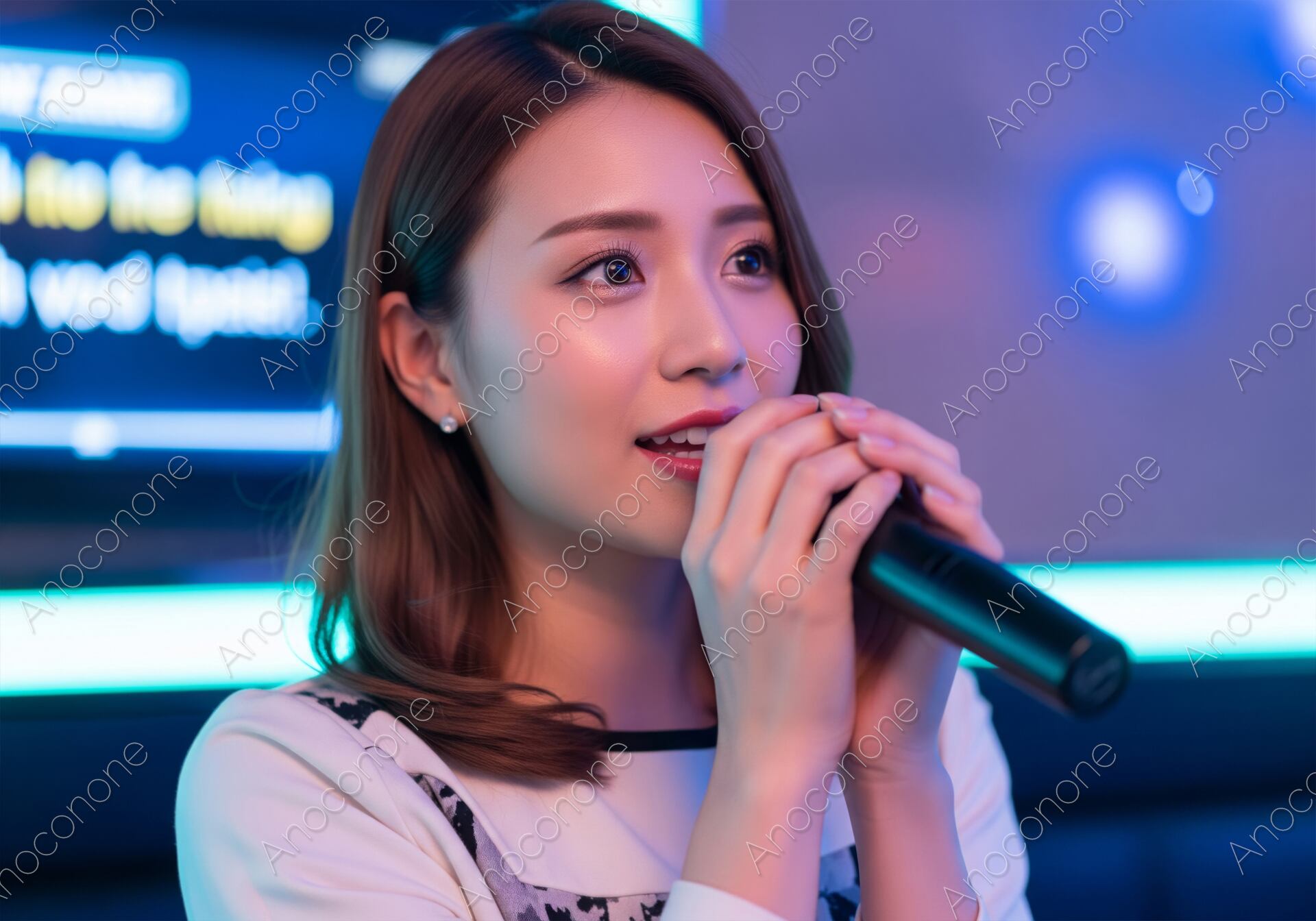 画像素材:カラオケボックスのネオンサインのような青い照明とスポットライトを浴びながら、マイクを両手で持ち、楽しそうな表情で歌を熱唱している女性のアップのポートレート写真です。生き生きとした目元と、弾けるような笑顔が印象的で、パーティーや歓喜の雰囲気を伝えています。週末のレジャーやナイトライフ、娯楽に関するウェブサイト、広告、雑誌などのビジュアル素材としてご利用ください。