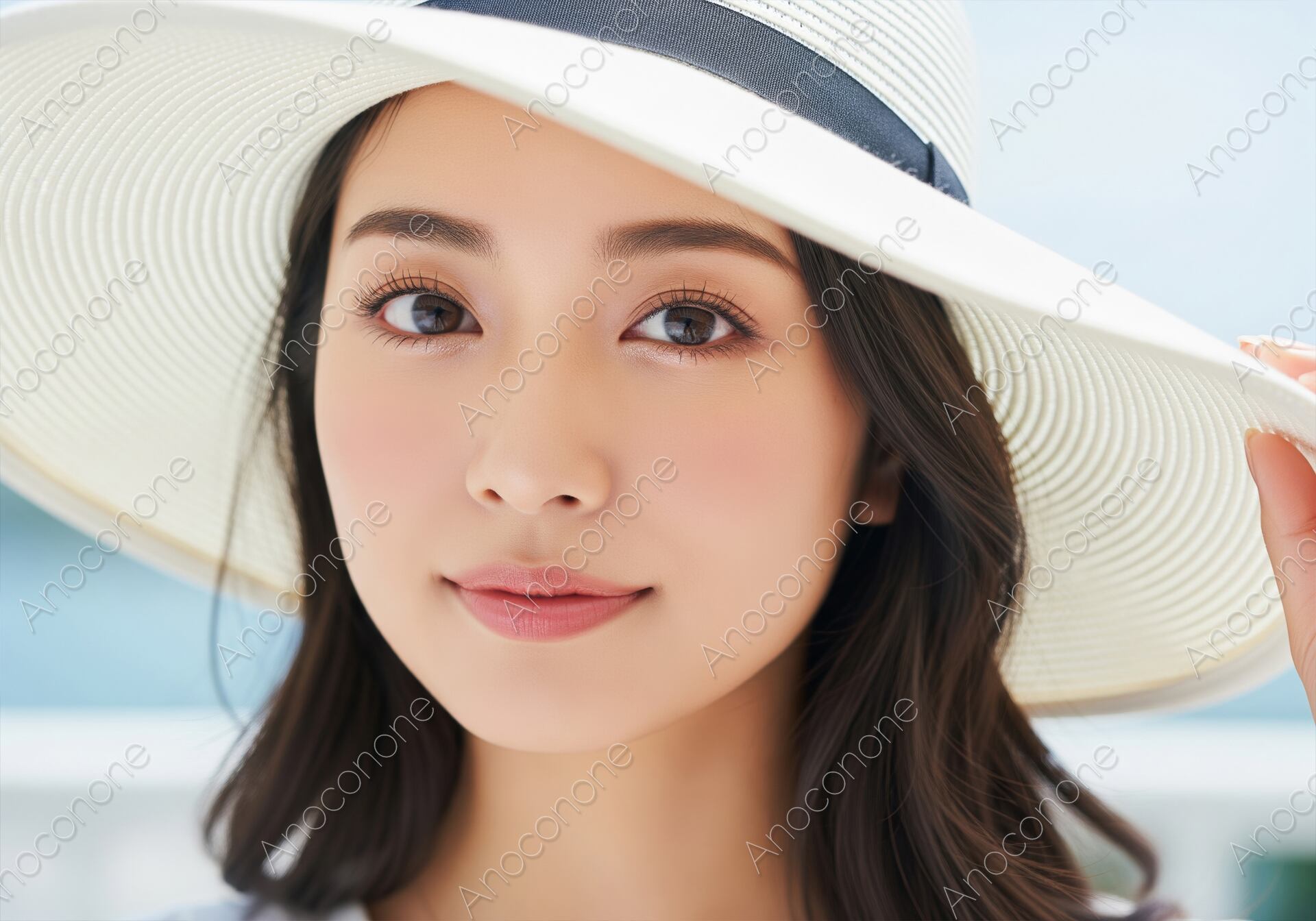 画像素材:夏の強い日差しを遮るために白いサマーハットを目深に被った、エレガントで清楚な雰囲気をまとう美しい女性のアップの画像素材です。涼しげで潤んだ瞳と自然な血色感のある頬が印象的で、透明感のある肌とナチュラルなメイクが被写体の魅力を最大限に引き出しています。夏のバカンスや美容、化粧品、ファッションに関連する広告やWebデザイン、パンフレットなど、さまざまなクリエイティブにご活用いただける高品質な一枚です。