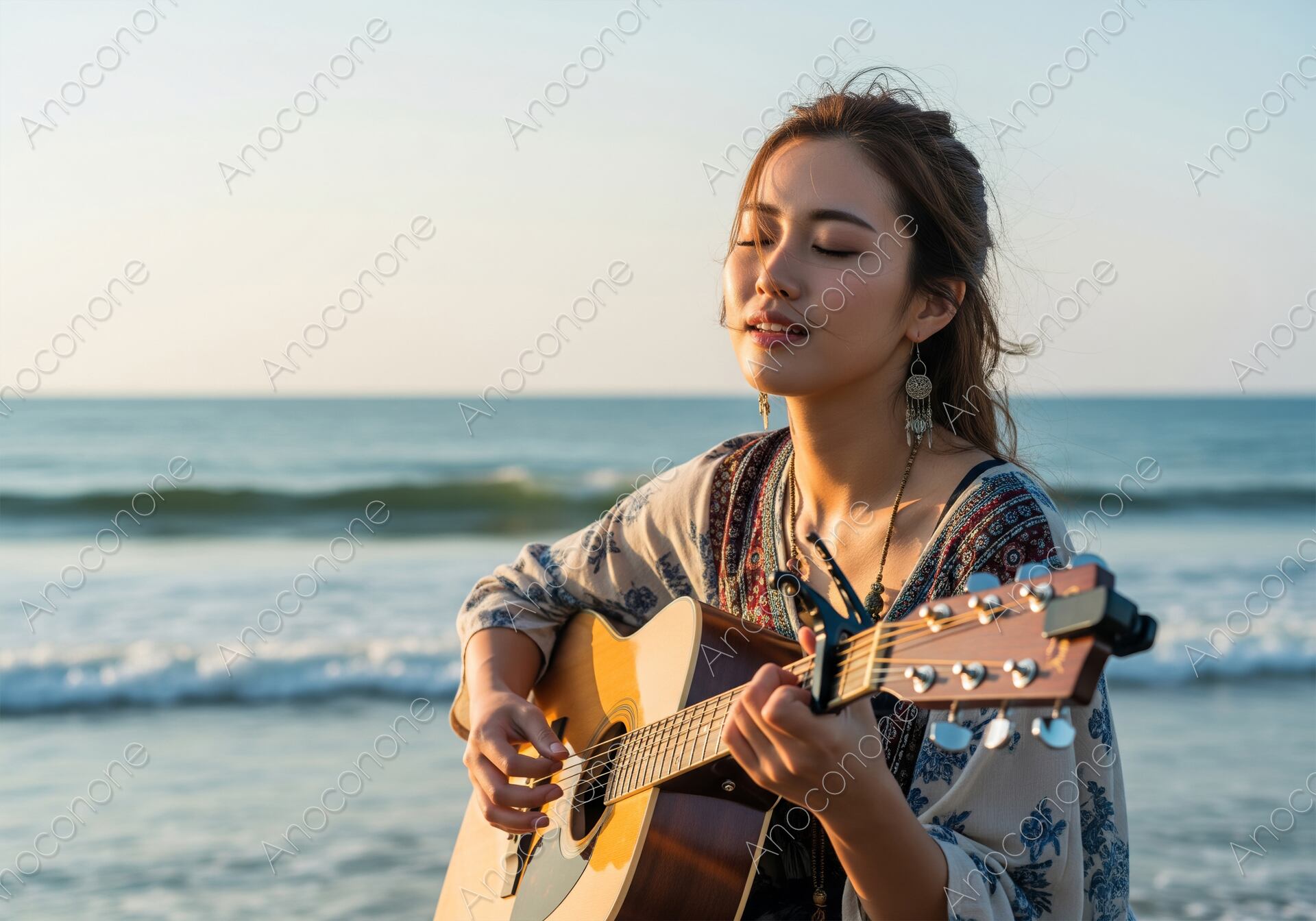 画像素材:夕暮れ時の穏やかなビーチを背景に、目を閉じアコースティックギターを奏でる美しい女性の姿を捉えた一枚です。風に揺れる髪と民族調のアクセサリー、そして柔らかな光が、自由でリラックスしたボヘミアンスタイルを強調しています。彼女の表情は音楽に没頭し、心地よいメロディーが聞こえてくるような、非常に情緒的で魅力的な雰囲気を持っています。この画像は、音楽、旅、自由なライフスタイルをテーマにした広告、Webサイト、ブログ記事などに最適です。