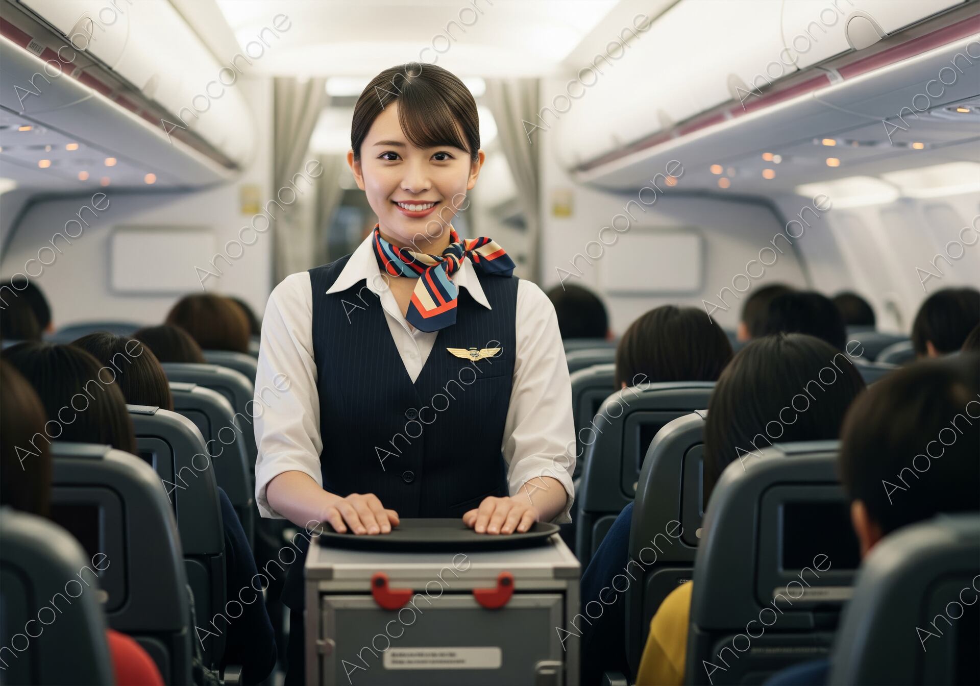 画像素材:飛行機のエコノミークラスの通路で、機内サービスカートの前に立ち、優しくプロフェッショナルな笑顔を浮かべる客室乗務員(CA)の女性を捉えた一枚です。きちんと整えられた制服とスカーフ、丁寧な立ち振る舞いが、安心感と高いサービス精神を伝えています。背景には乗客の座席が広がり、実際のフライトの状況がリアルに表現されています。この画像は、航空業界、旅行、接客サービス、またはキャリアをテーマにしたコンテンツ制作に最適です。